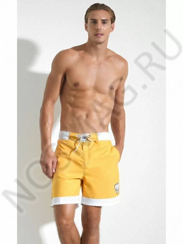 Яркие модные мужские шорты с удобными боковыми карманами. Дизайн модели подчеркнут контрастными белыми вставками. Пояс шорт имеет кулиску.