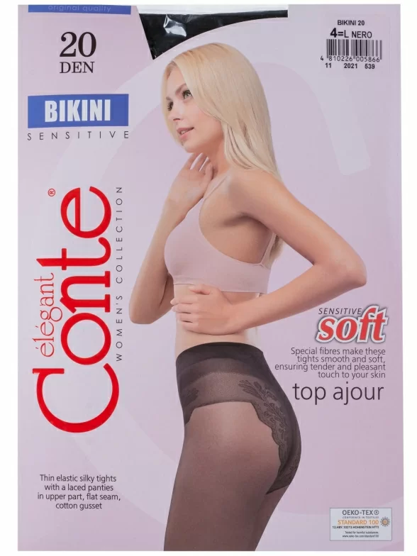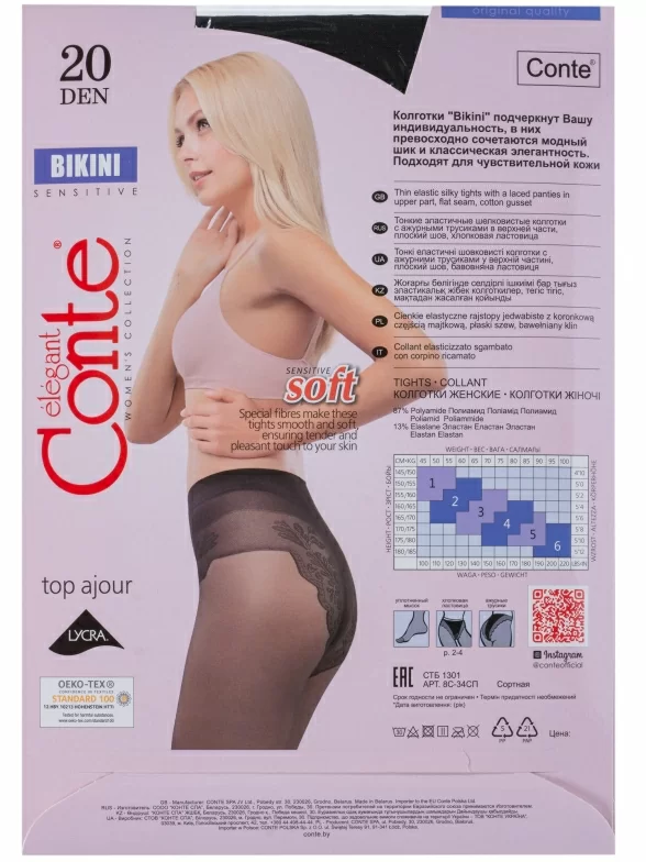 Классическая модель плотностью 20 den c имитацией ажурных трусиков, высокой талией, хлопковой ластовицей и уплотненным мыском. Колготки мягкие и нежные, связаны из нитей с улучшенными тактильными свойствами, поэтому они идеально подойдут для обладательниц чувствительной кожи.