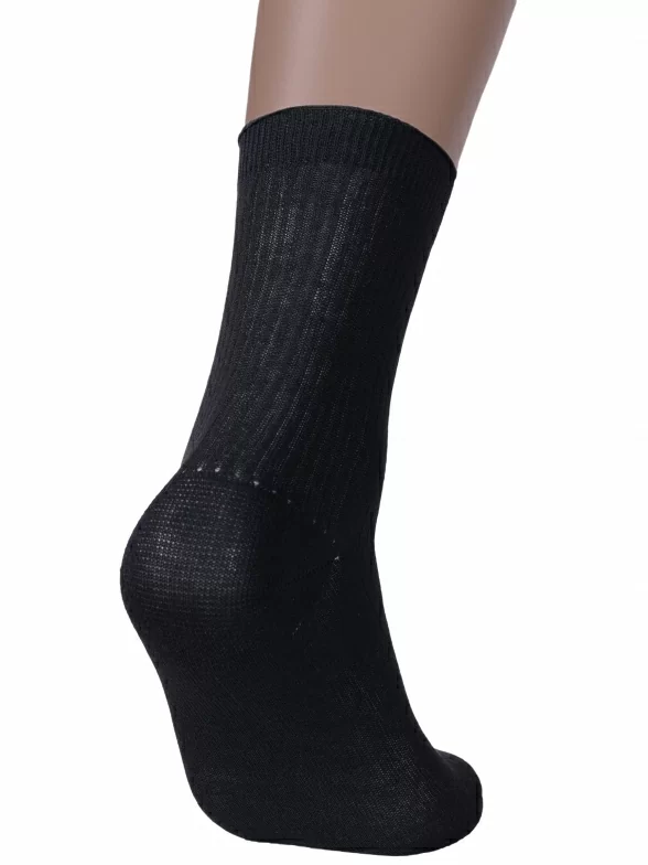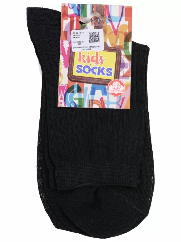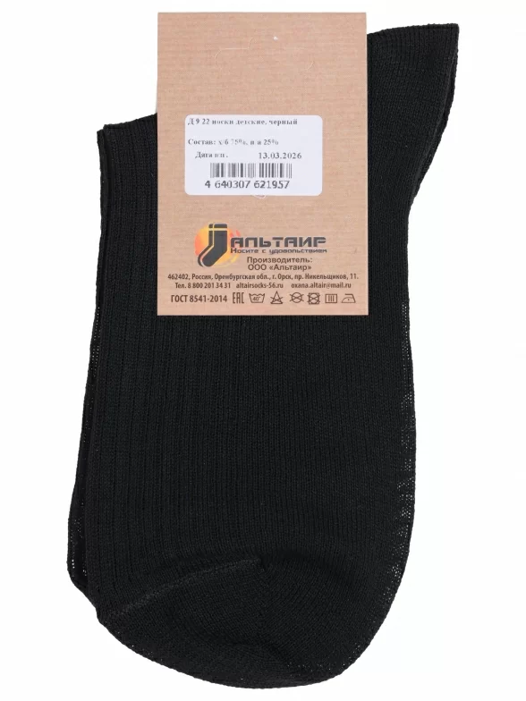 Межсезонные или летние средней длины детские носки, цвет черный, классические, шов обычный (не бесшовные), принт (рисунок): однотонный, без рисунков/узоров, состав: 75% хлопок, 25% полиамид, арт. Д9. Производитель «ООО Альтаир, г. Орск, Оренбургская обл, Россия» под брендом «Альтаир».