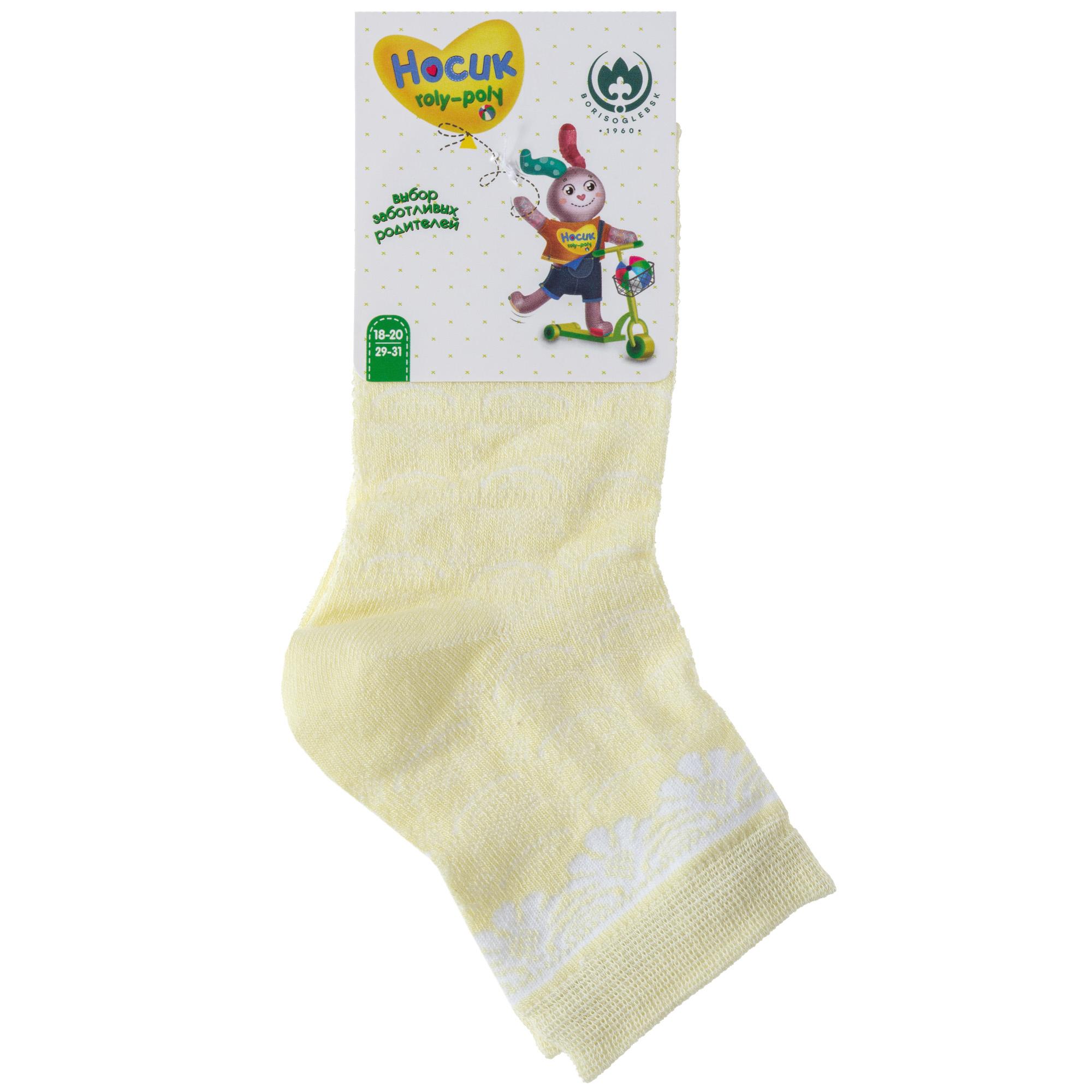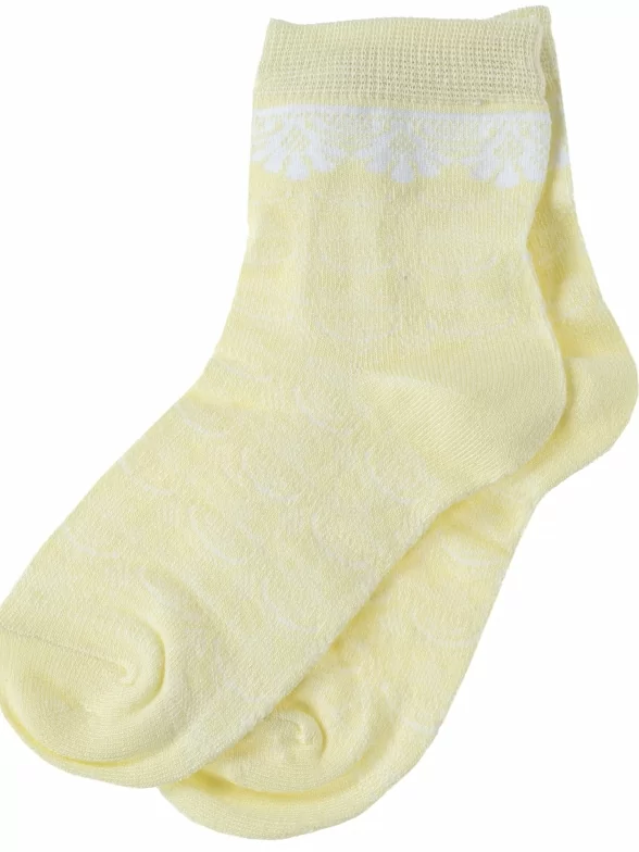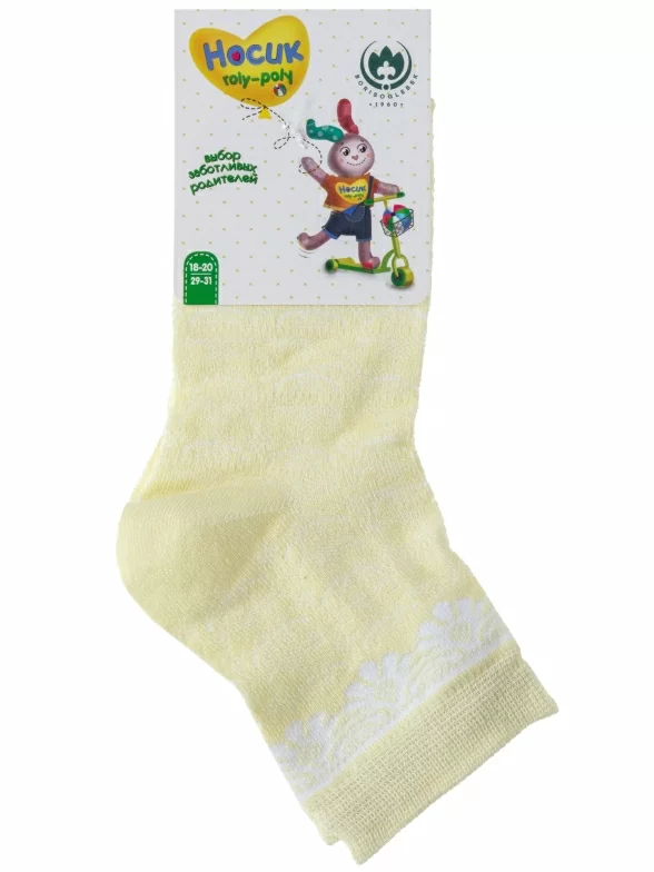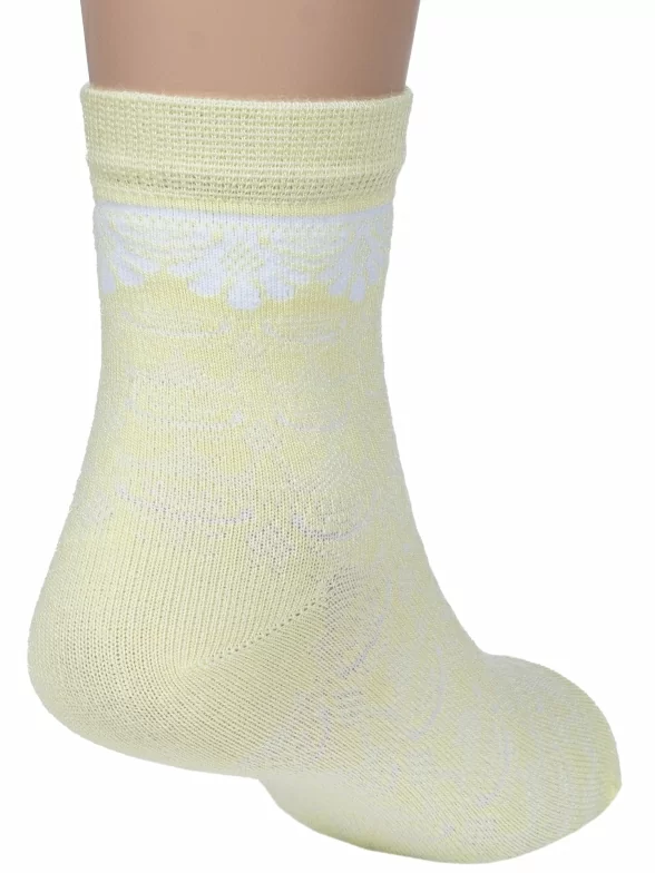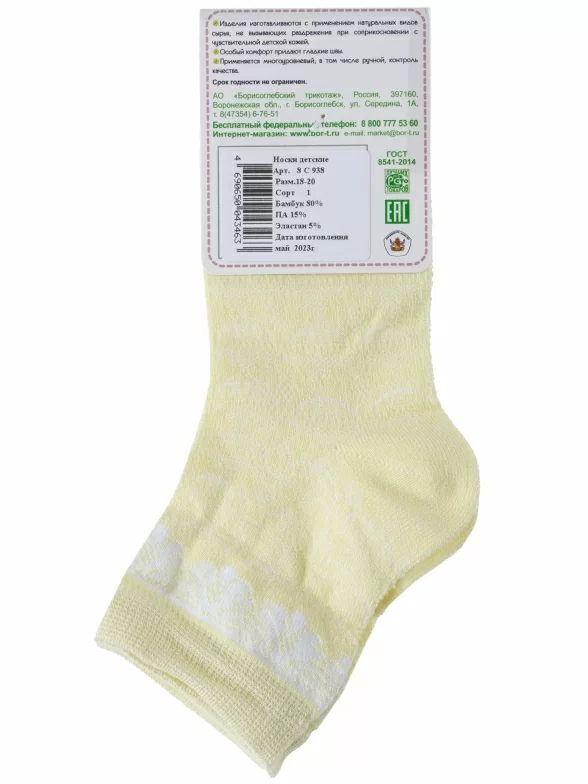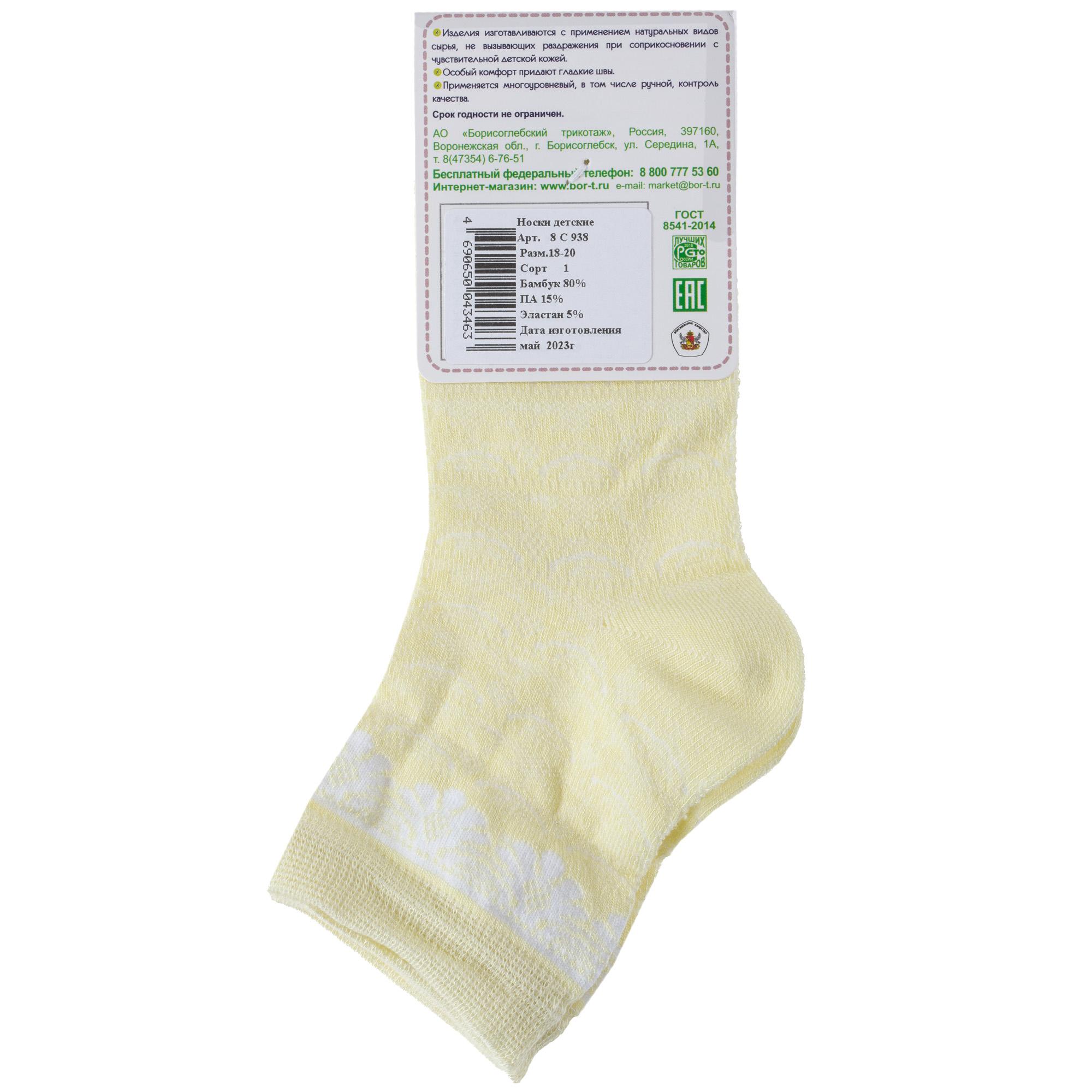 Летние укороченные детские носки, цвет желтый, ажурные, повседневные, шов обычный (не бесшовные), принт (рисунок): цветы / растения, с узором, состав: 80% бамбук, 15% полиамид, 5% эластан, арт. 8С938. Производитель «АО Борисоглебский трикотаж, Воронежская обл, Россия» под брендом «Борисоглебский трикотаж».