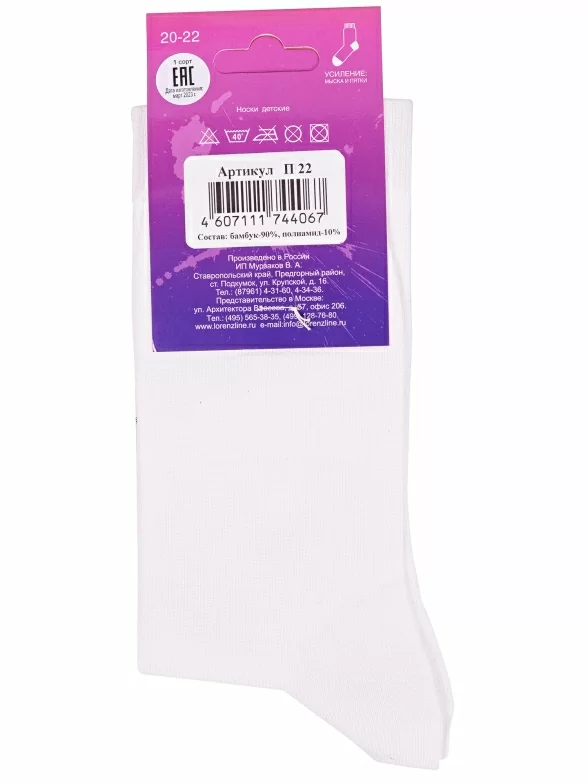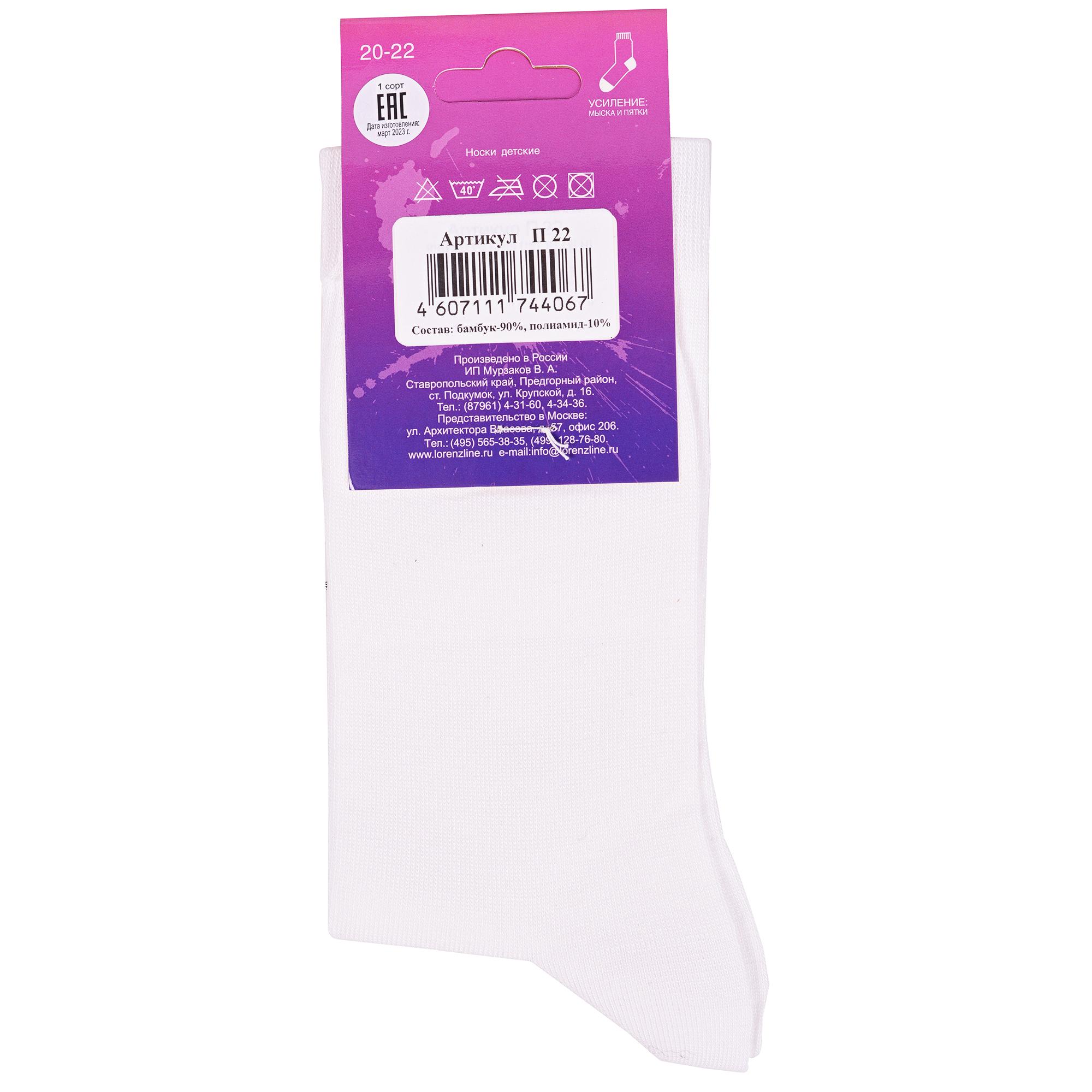 Межсезонные или летние средней длины детские носки, цвет белый, классические, возможно бесшовные, принт (рисунок): однотонный, без рисунков/узоров, состав: 90% бамбук, 10% полиамид, арт. П22. Производитель «ИП Мурзаков В.А., Ставропольский край, Россия» под брендом «Lorenzline».