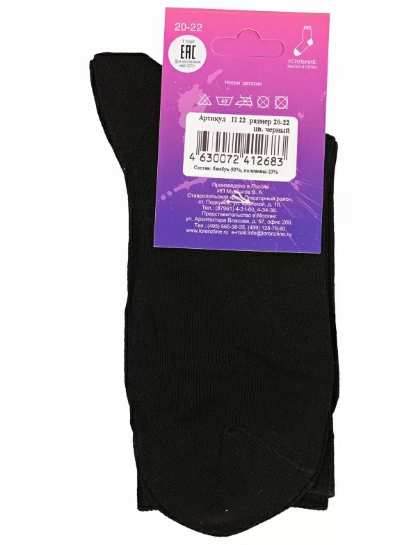 Межсезонные или летние средней длины детские носки, цвет черный, классические, возможно бесшовные, принт (рисунок): однотонный, без рисунков/узоров, состав: 90% бамбук, 10% полиамид, арт. П22. Производитель «ИП Мурзаков В.А., Ставропольский край, Россия» под брендом «Lorenzline».