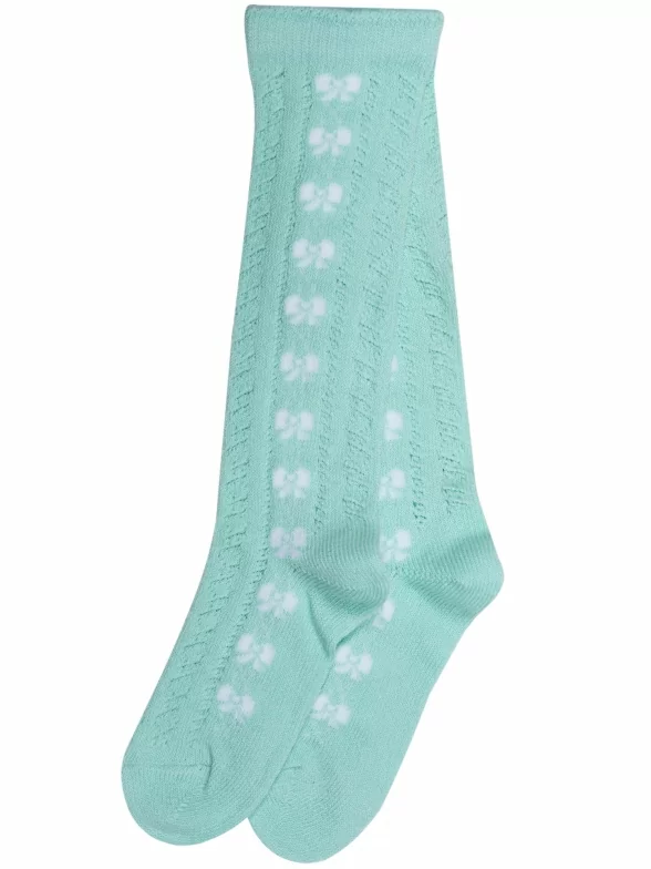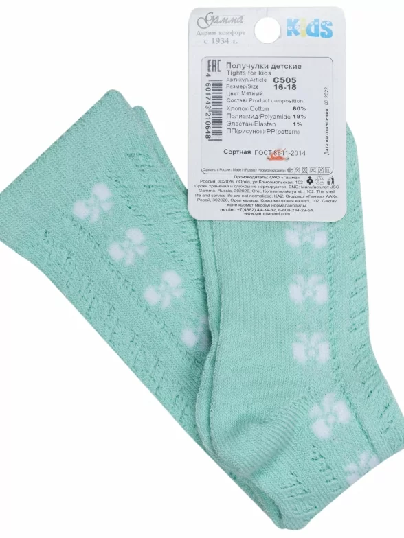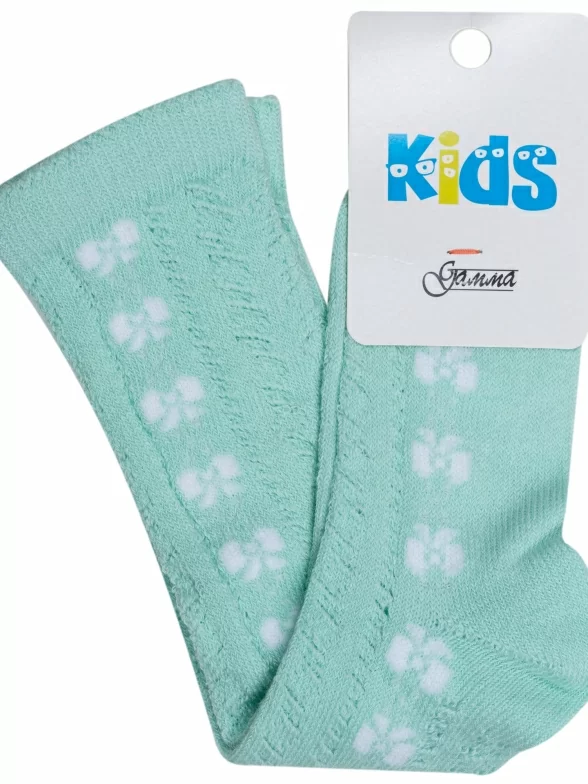 Летние детские гольфы, цвет бирюзовый, классические, шов обычный (не бесшовные), принт (рисунок): бабочки / бантики, с узором, однотонный, состав: 80% хлопок, 19% полиамид, 1% эластан, арт. С505. Производитель «ГАММА» Россия под брендом «Гамма».