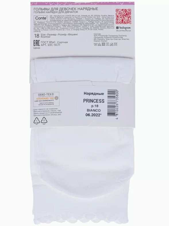 Летние детские гольфы, цвет белый, капроновые, шов обычный (не бесшовные), принт (рисунок): однотонный, без рисунков/узоров, состав: 92% полиамид, 8% эластан, арт. PRINCESS. Производитель «Conte, Беларусь» под брендом «Conte».
