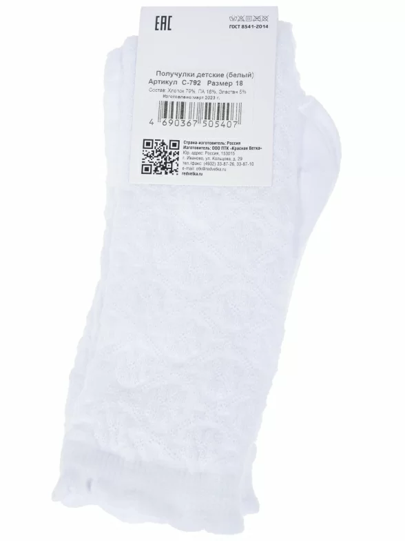 Летние детские носки, цвет белый, ажурные, состав: 79% хлопок, 16% полиамид, 5% эластан, фабричный артикул С-792. Производитель «КРАСНАЯ ВЕТКА» Россия под брендом «Красная ветка».