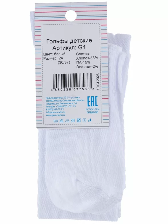 Летние детские гольфы, цвет белый, в сеточку, классические, шов обычный (не бесшовные), принт (рисунок): однотонный, состав: 83% хлопок, 15% полиамид, 2% эластан, арт. G1. Производитель «ПРОМЭКС ООО, Смоленская область, Россия» под брендом «Para socks».