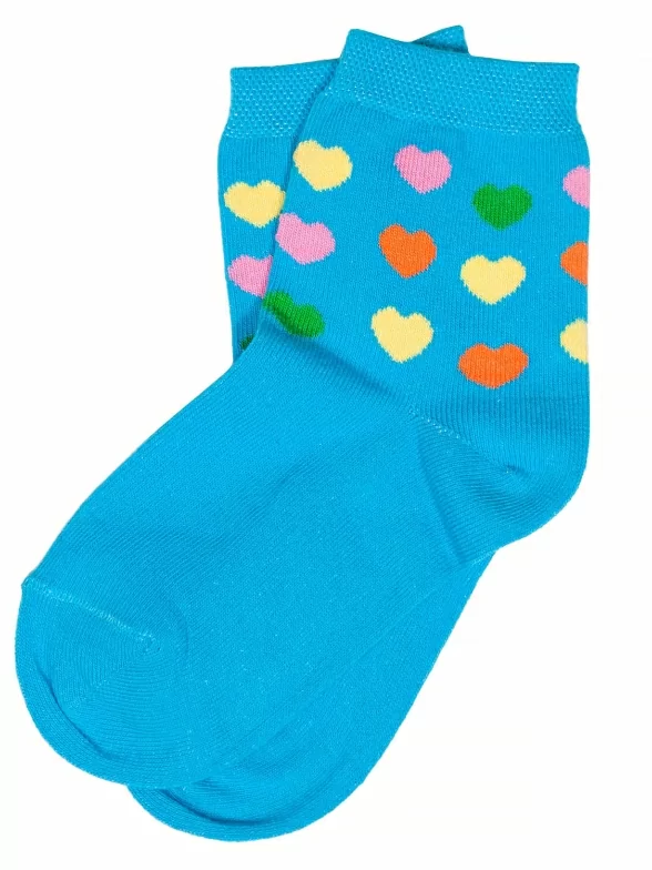 Очаровательные детские носки из приятного хлопкового трикотажа. Нежная расцветка сочетается с милым принтом в виде сердечек. Такой принт украшает паголенок каждого носка.