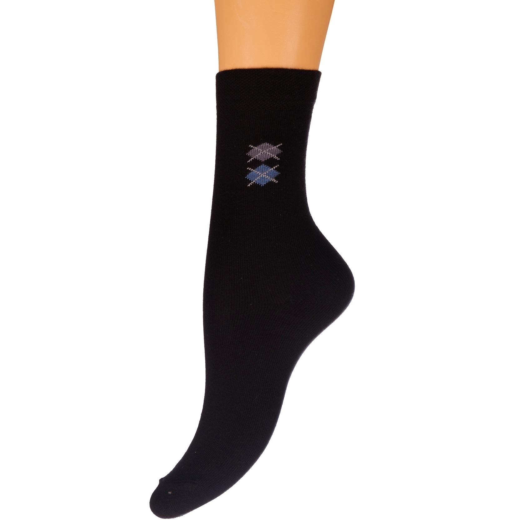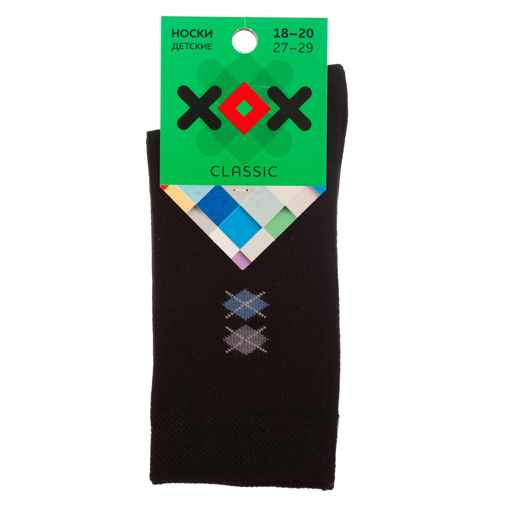 Хлопковые детские носки ХОХ классической длины. Плотные, с высоким содержанием хлопкаи эластичные, благодаря входящим в состав полиамиду и эластану. Связаны в черном цвете и имеют небольшой геометрический узор.