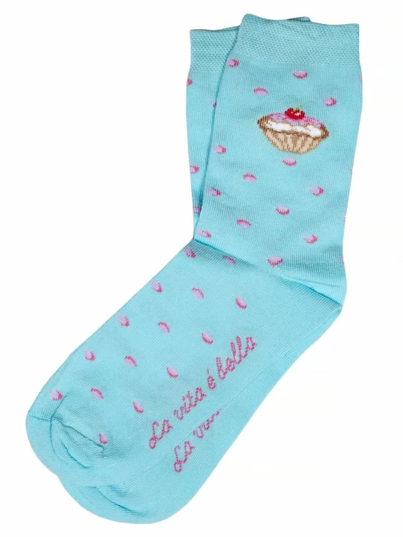 Детские носки классической длины. Они связаны из приятного трикотажа с высоким содержанием хлопка и отличаются удобной резинкой. Носки оформлены милым узором и рисунком в виде аппетитного пирожного.
