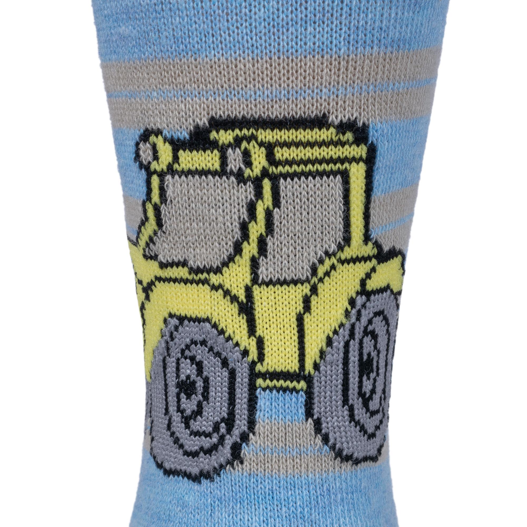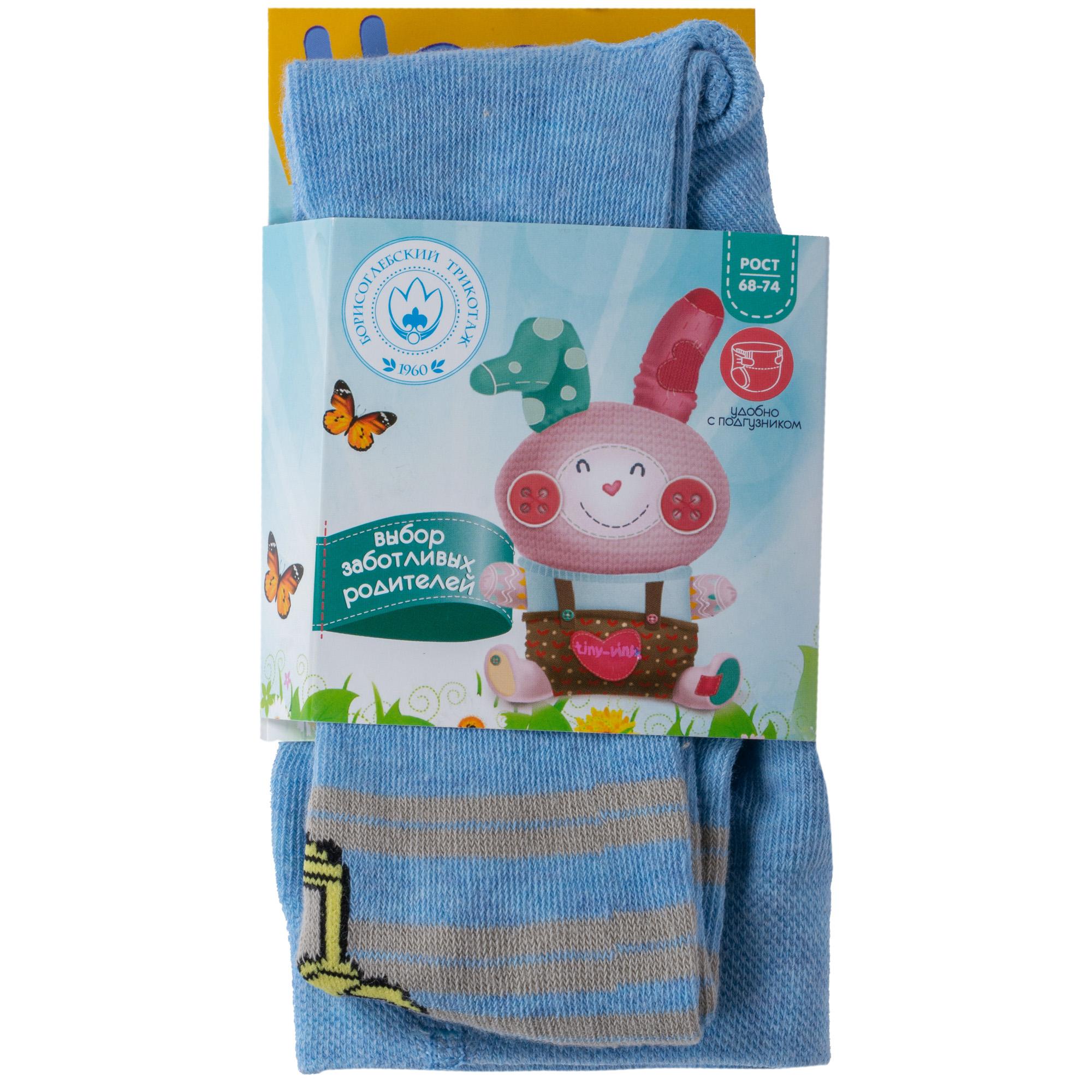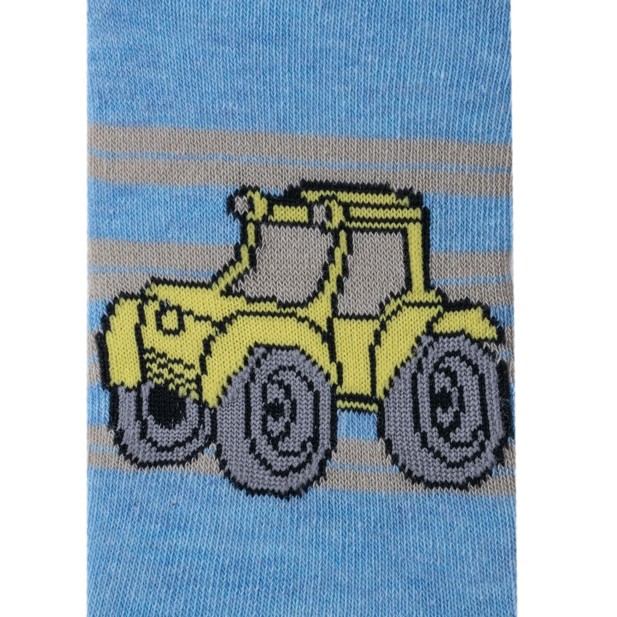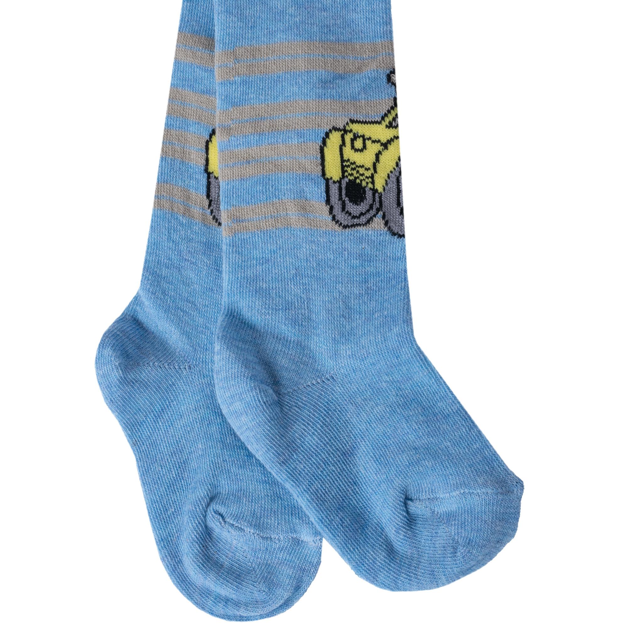 Детские колготки фабрики "Борисоглебский трикотаж" с принтом в виде трактора и полосок, расположенных ниже колена. Подойдут мальчикам для прогулок или детского сада в демисезонный период.