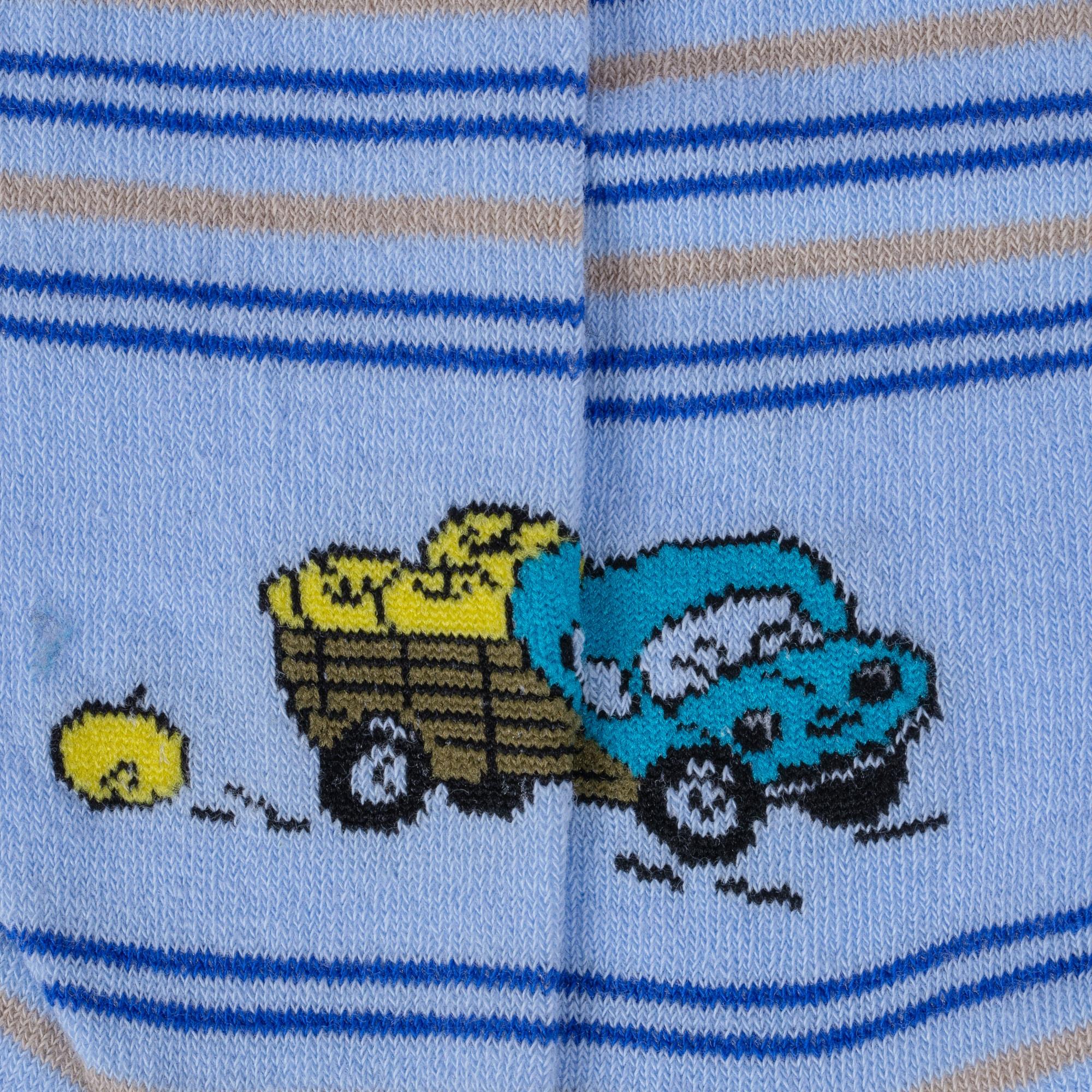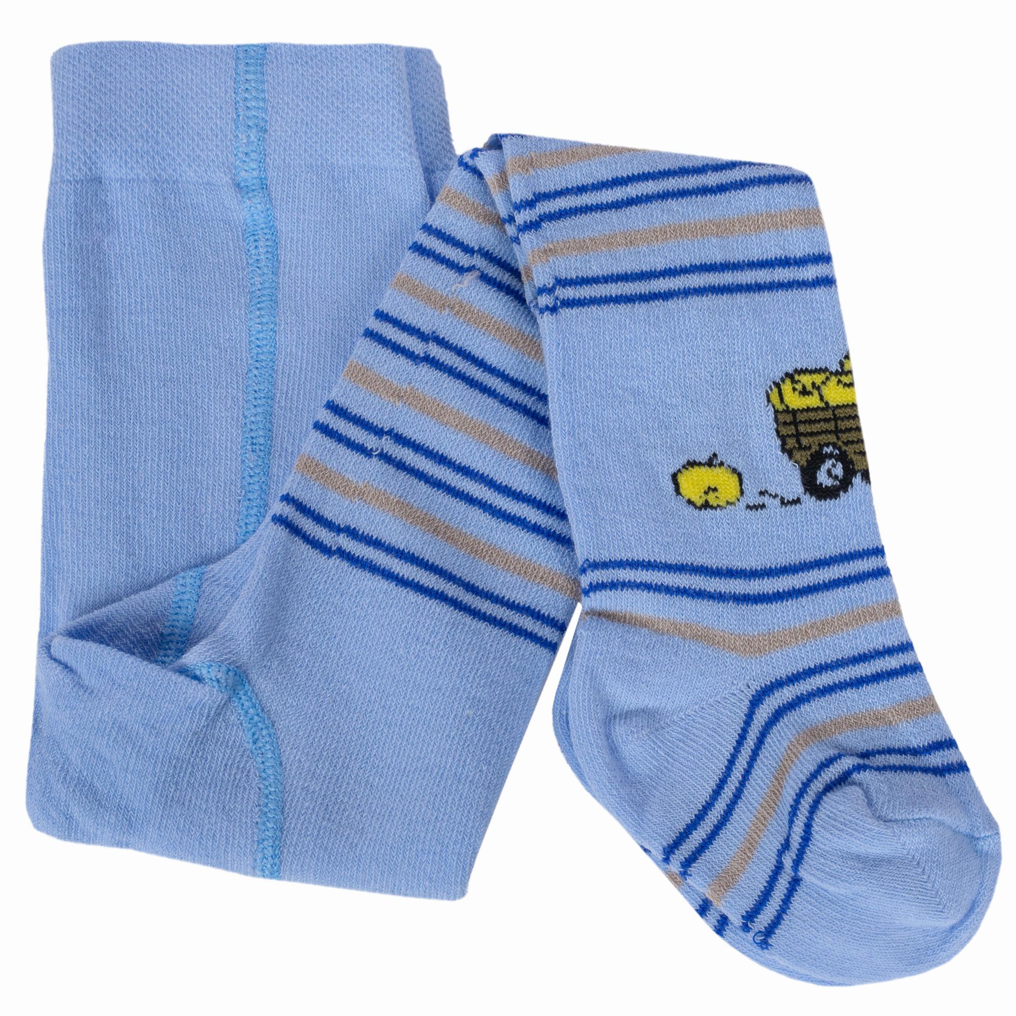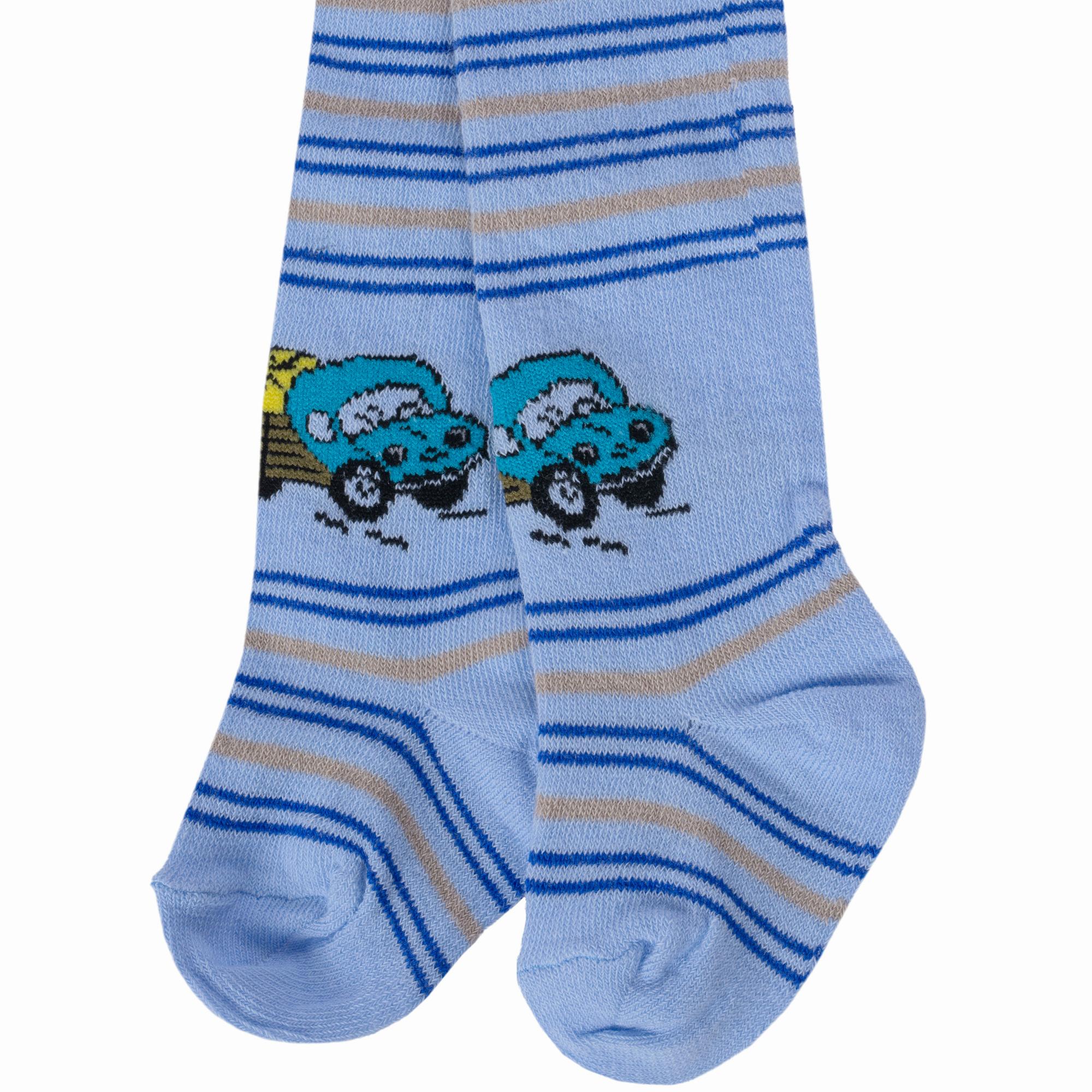 Детские колготки фабрики "Борисоглебский трикотаж" с принтом в виде машинки и полосок.