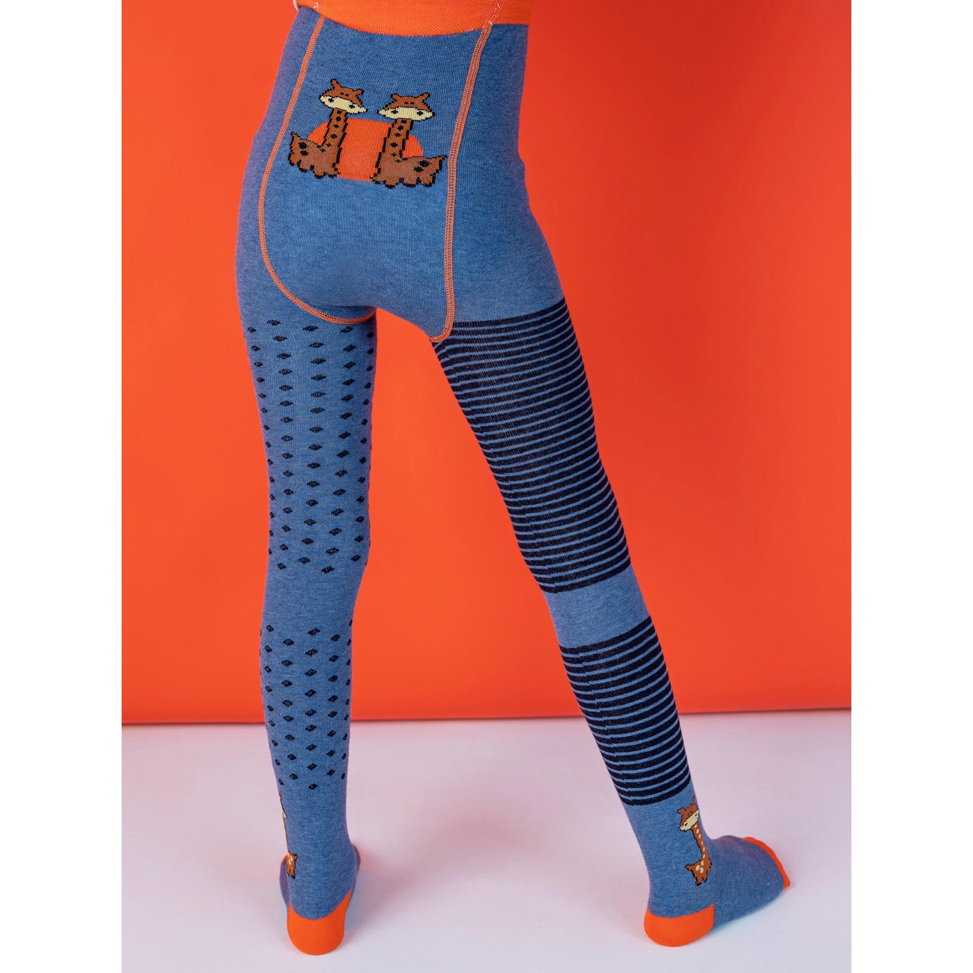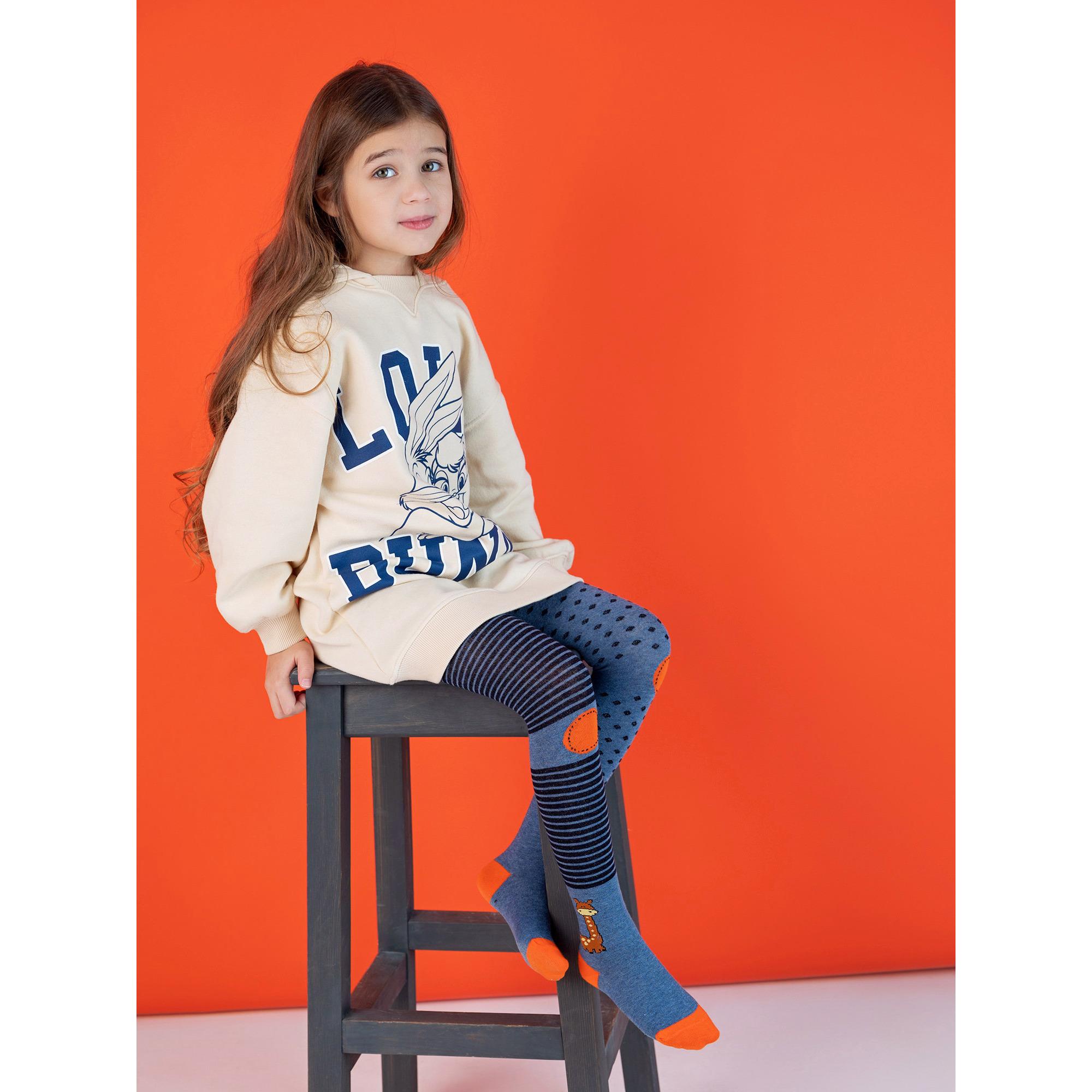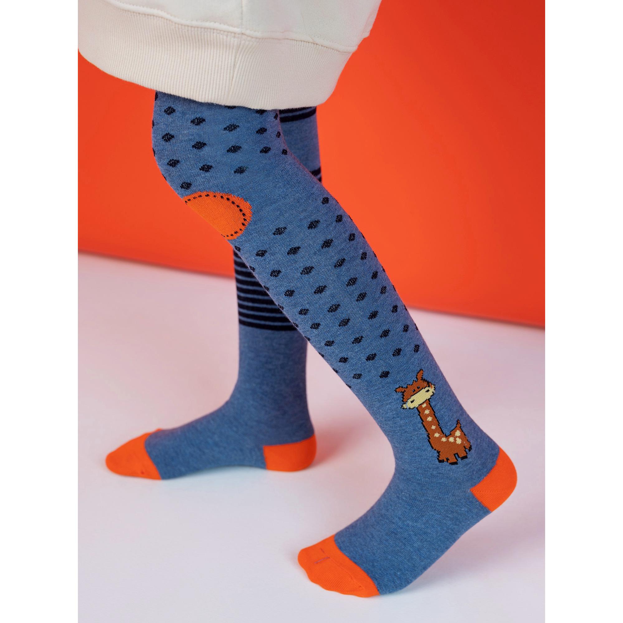Детские колготки фабрики "Красная ветка" с разными принтами на каждой ножке: на правой - полоски, на левой - мелкий ромбик. На коленках имеется узор, имитирующий нашивки, а сзади - жирафы на фоне солнца. Подойдут девочкам для прогулок и детского сада в демисезонный период.
