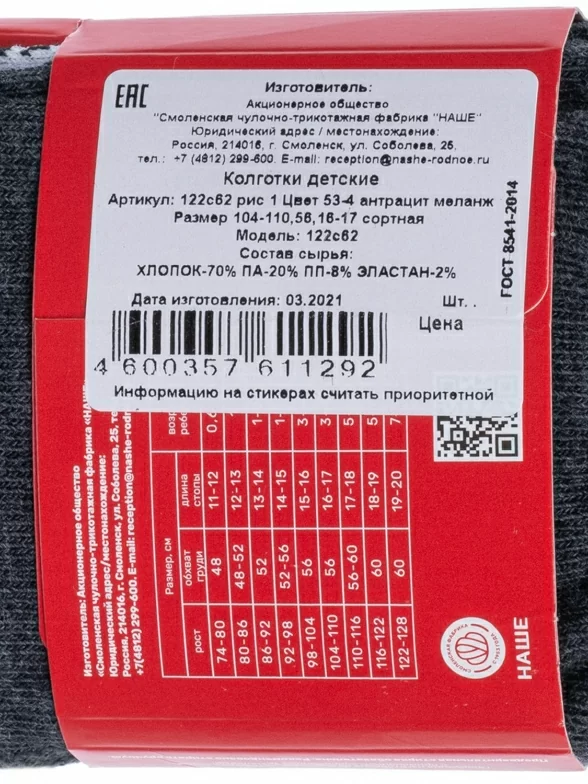 Детские колготки "НАШЕ" Смоленской чулочной фабрики, 122С62, рис. 1, АНТРАЦИТ МЕЛАНЖ №53-4