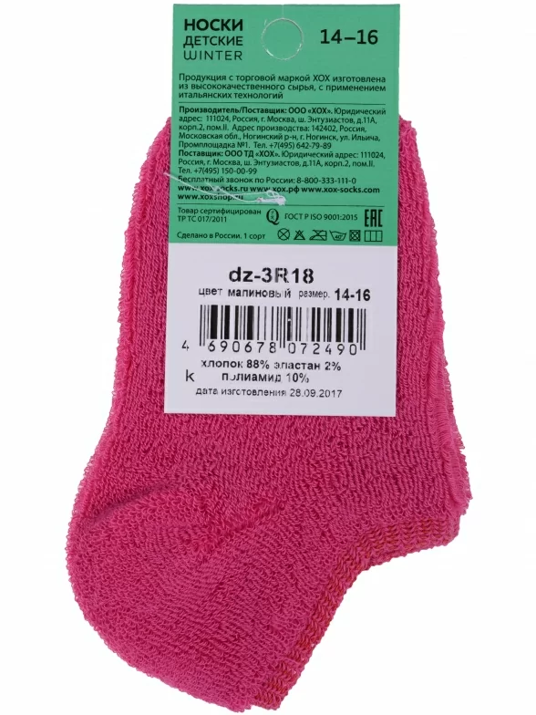 Зимние или межсезонные короткие детские носки, цвет розовый, махровые, шов обычный (не бесшовные), принт (рисунок): без рисунков / узоров, однотонный, состав: 88% хлопок, 10% полиамид, 2% эластан, арт. DZ-3R18. Производитель «ХОХ» Россия под брендом «Хох».