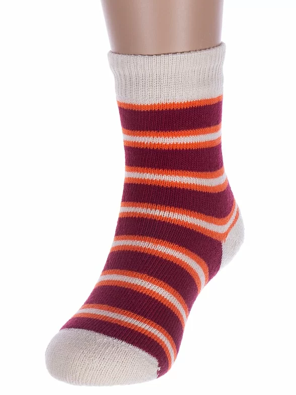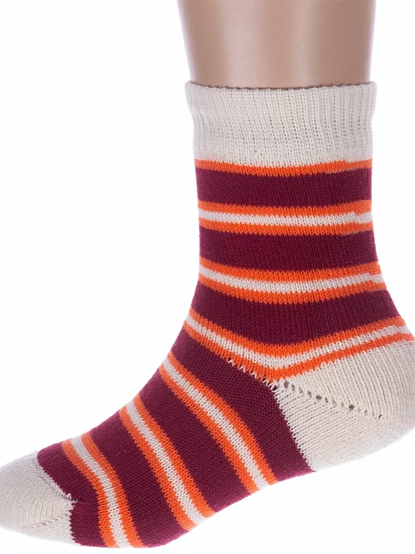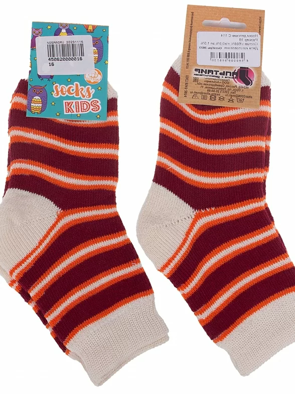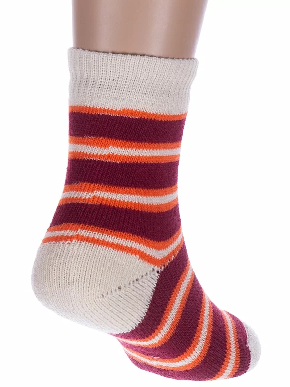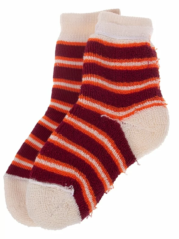 Межсезонные или зимние укороченные детские носки, цвет кремовый-бордовый, теплые, повседневные, махровые, возможно бесшовные, принт (рисунок): полоски, с узором, состав: 98% хлопок, 1.5% эластан, 0.5% полиамид, арт. С114. Производитель «ООО Альтаир, г. Орск, Оренбургская обл, Россия» под брендом «Альтаир».