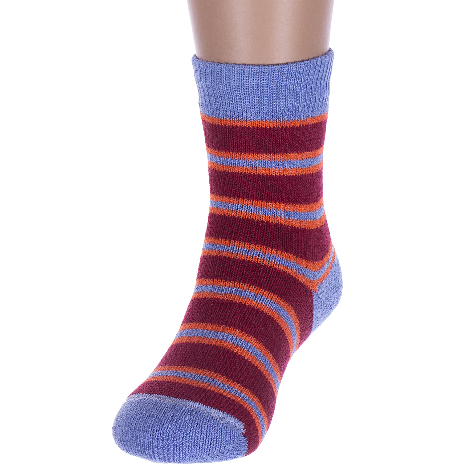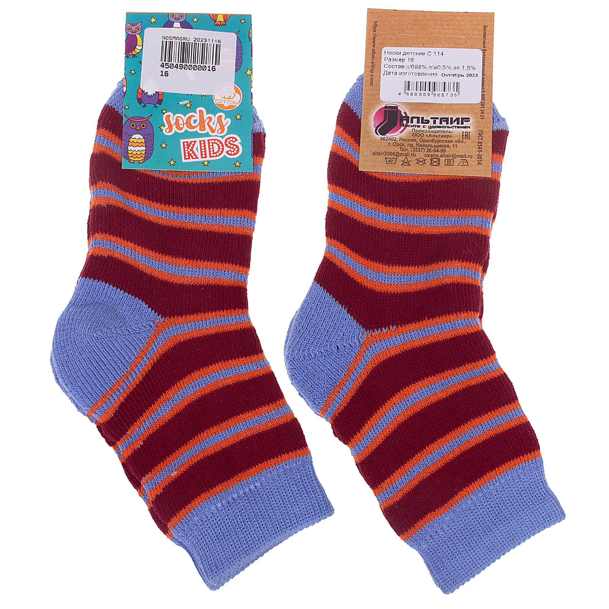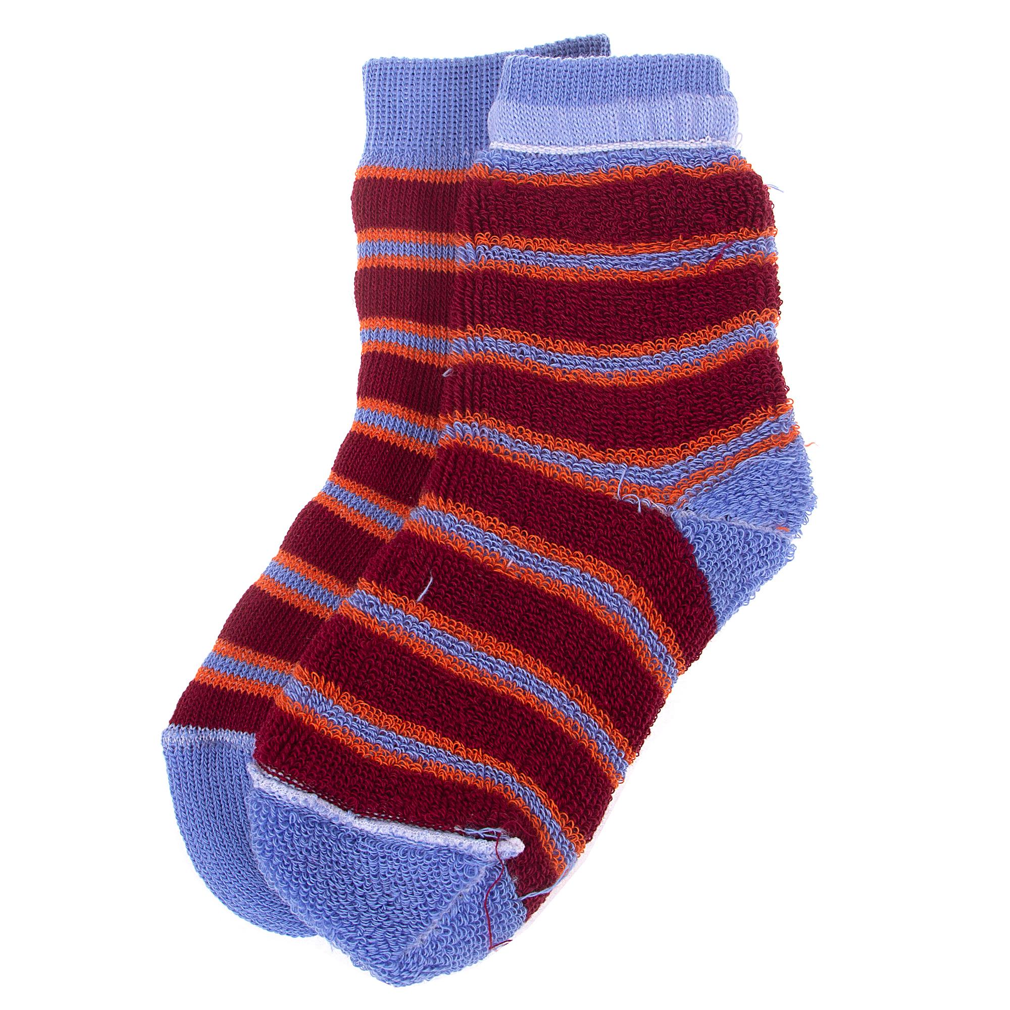 Межсезонные или зимние укороченные детские носки, цвет голубой-бордовый, теплые, повседневные, махровые, возможно бесшовные, принт (рисунок): полоски, с узором, состав: 98% хлопок, 1.5% эластан, 0.5% полиамид, арт. С114. Производитель «ООО Альтаир, г. Орск, Оренбургская обл, Россия» под брендом «Альтаир».