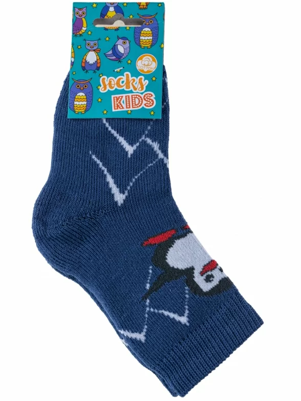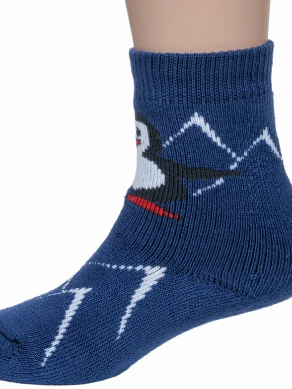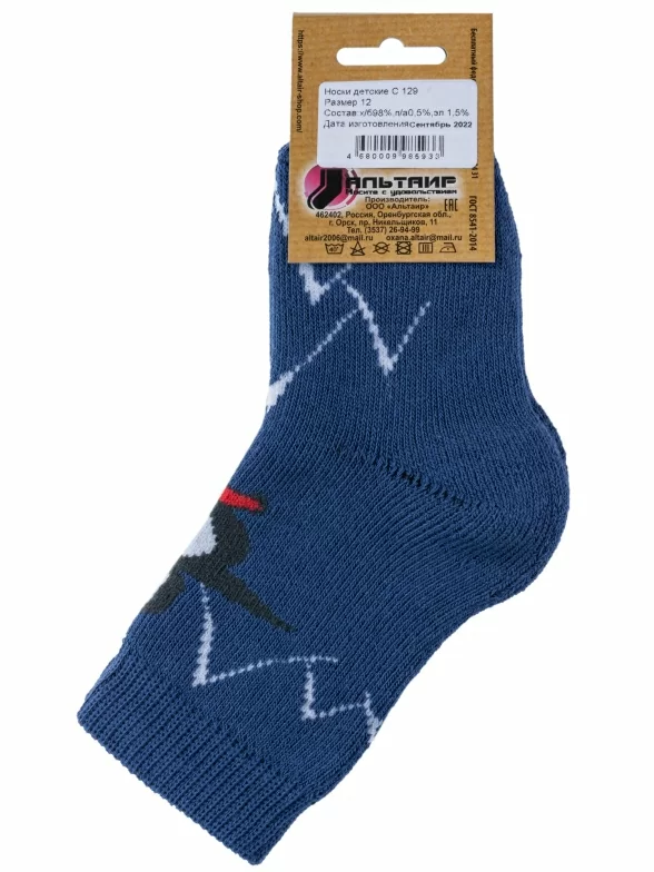 Зимние средней длины детские носки, цвет синий-джинс, теплые, повседневные, махровые, шов обычный (не бесшовные), принт (рисунок): животные, с узором, состав: 98% хлопок, 0.5% полиамид, 1.5% эластан, арт. С129. Производитель «ООО Альтаир, г. Орск, Оренбургская обл, Россия» под брендом «Альтаир».