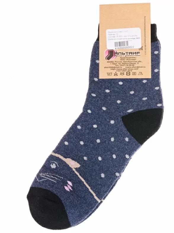 Межсезонные или зимние укороченные детские носки, цвет джинс, теплые, состав: 80% хлопок, 18% полиамид, 2% эластан, фабричный артикул С112. Производитель «ООО Альтаир, г. Орск, Оренбургская обл, Россия» под брендом «Альтаир».