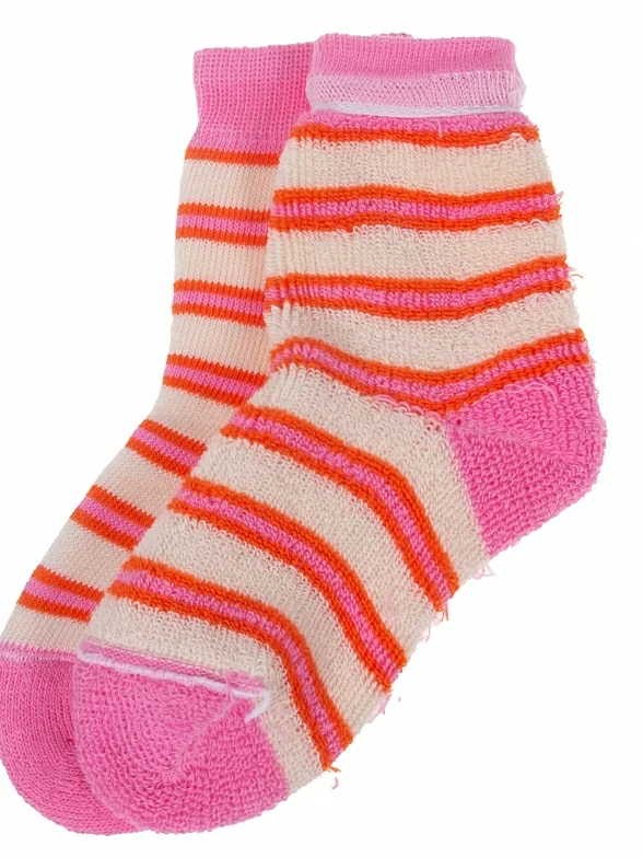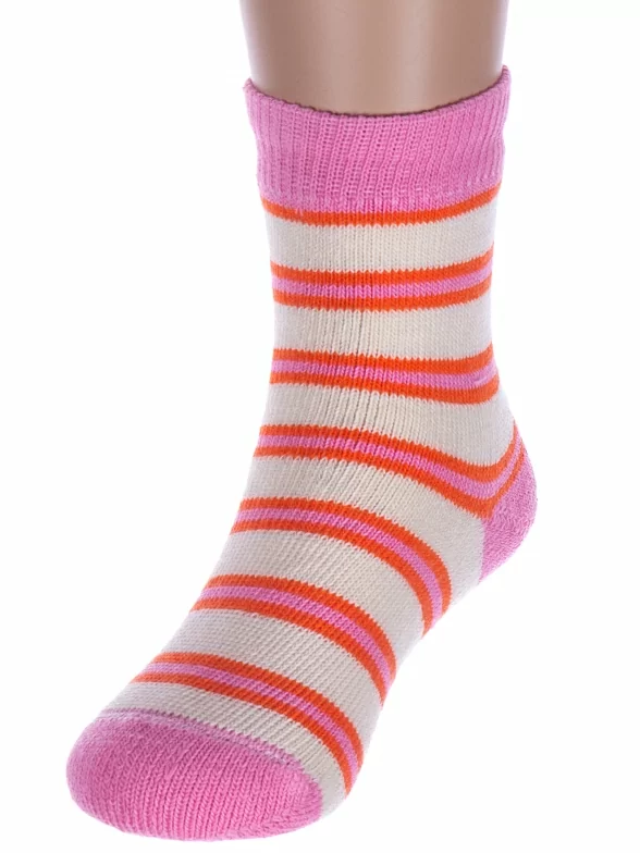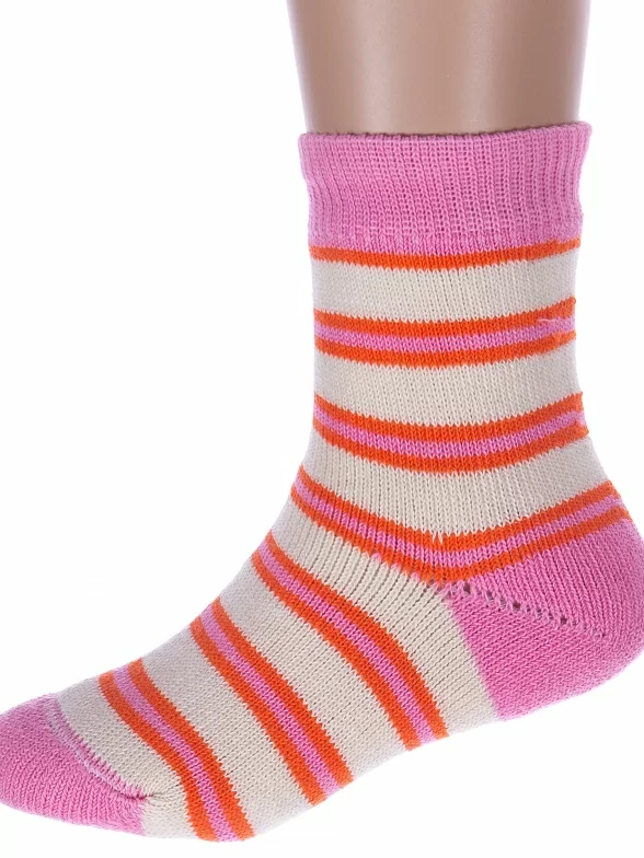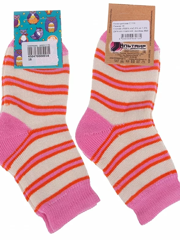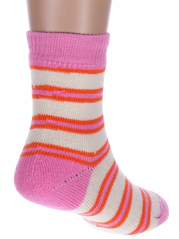 Межсезонные или зимние укороченные детские носки, цвет розовый-кремовый, теплые, повседневные, махровые, возможно бесшовные, принт (рисунок): полоски, с узором, состав: 98% хлопок, 1.5% эластан, 0.5% полиамид, арт. С114. Производитель «ООО Альтаир, г. Орск, Оренбургская обл, Россия» под брендом «Альтаир».