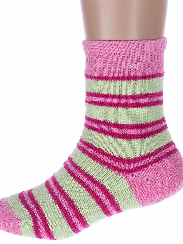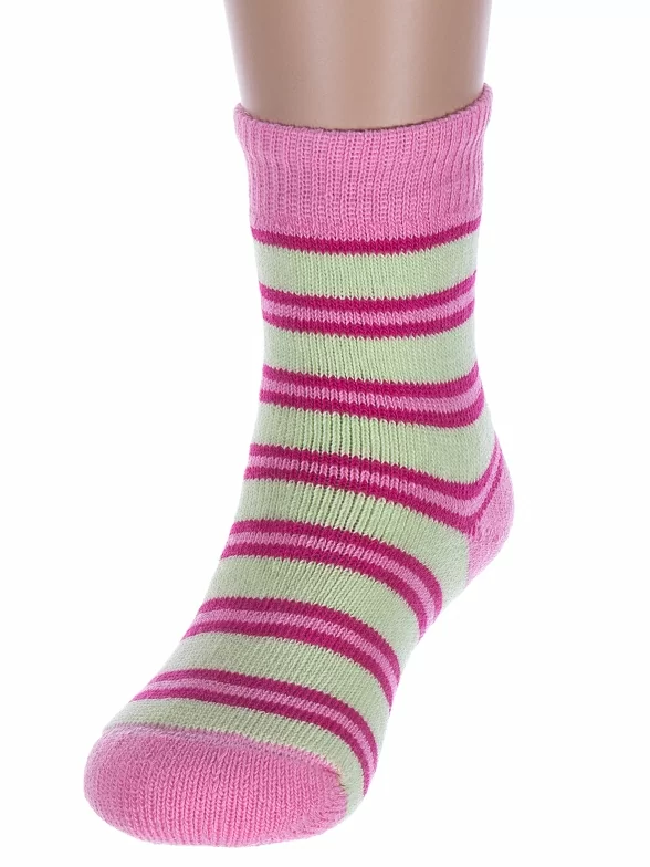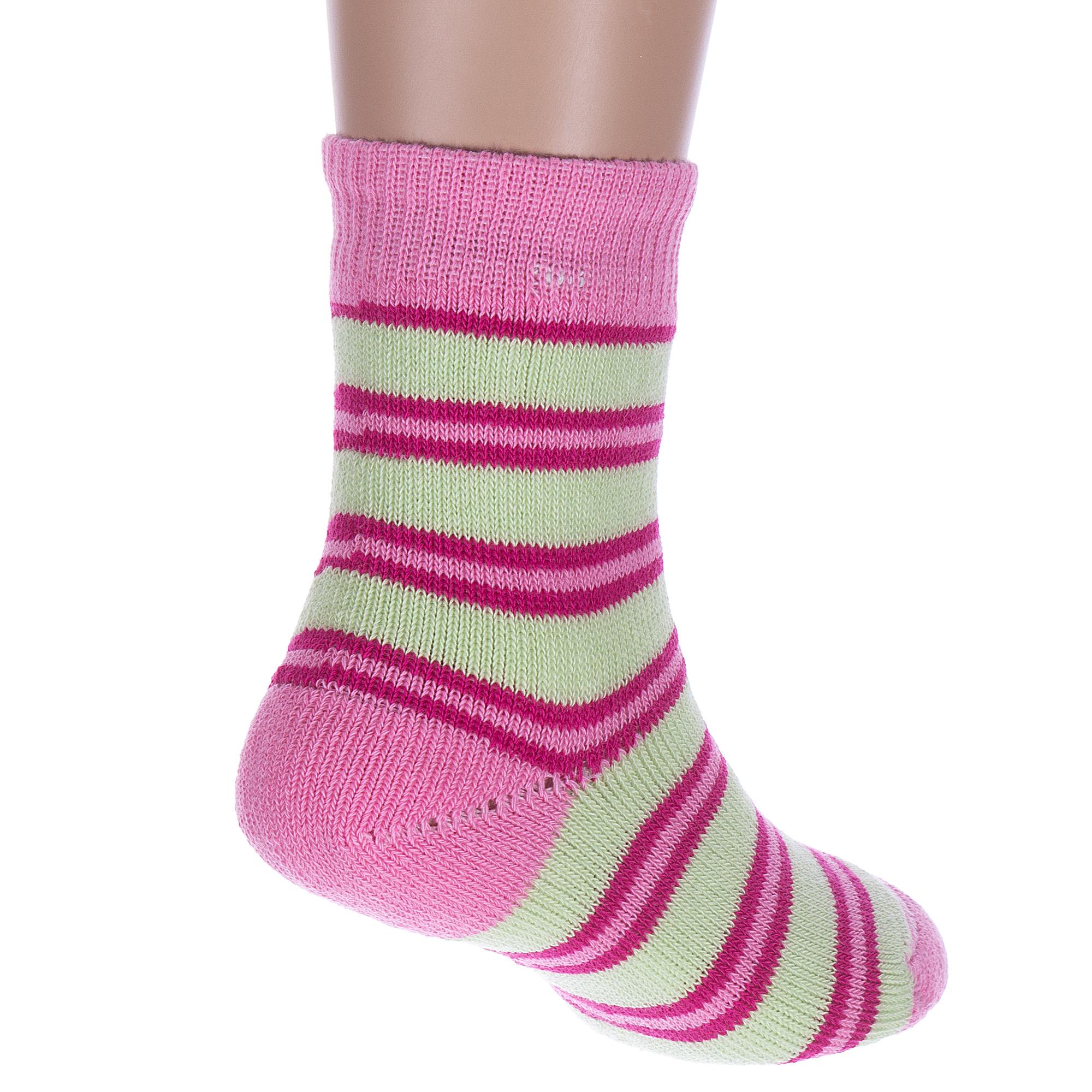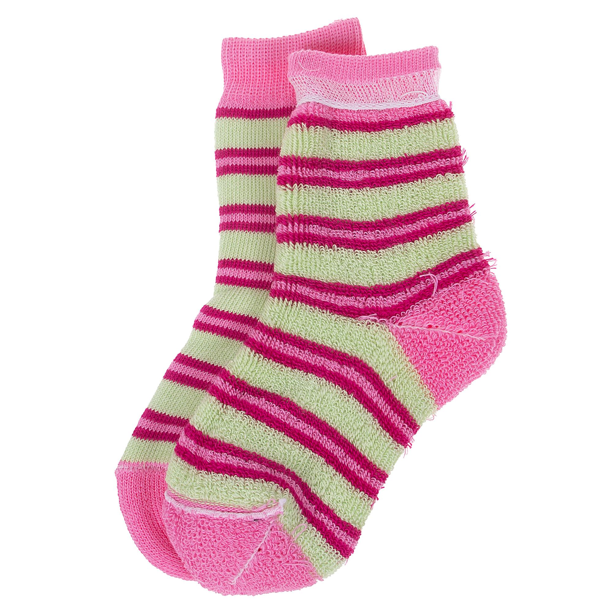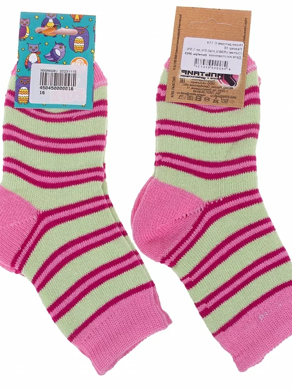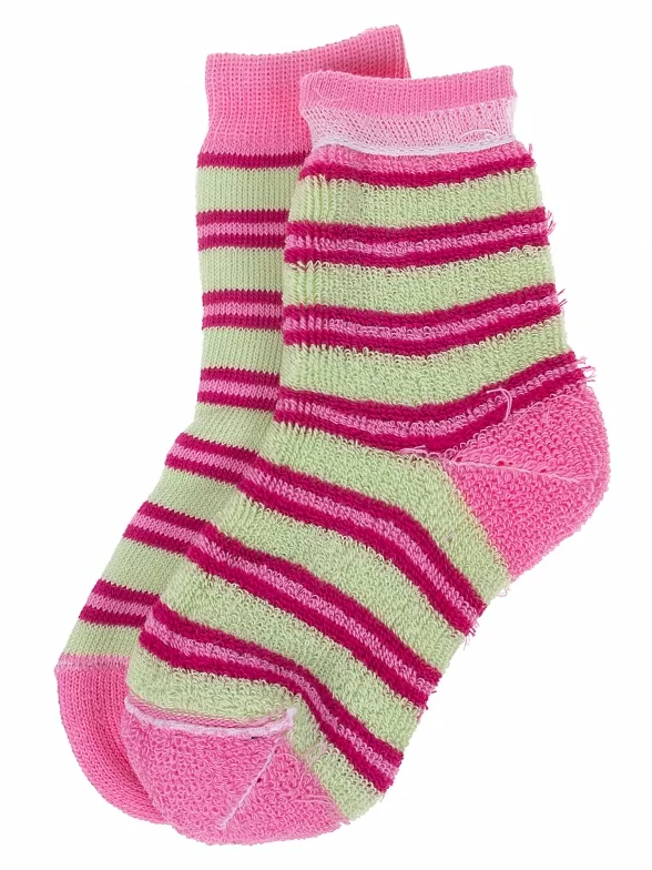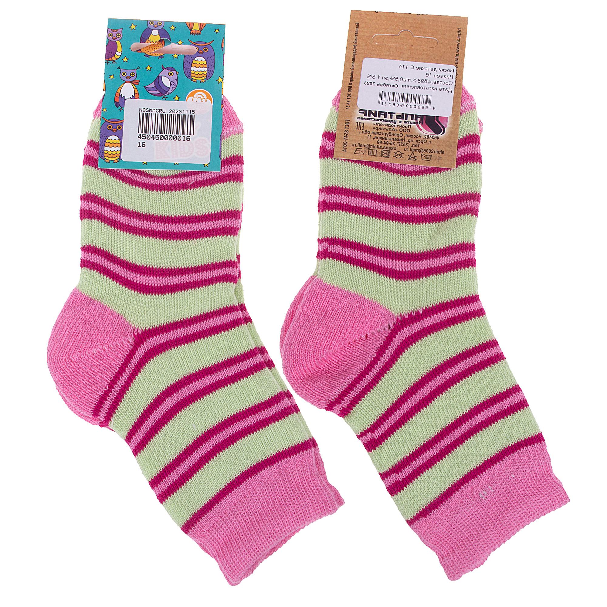 Межсезонные или зимние укороченные детские носки, цвет салатовый-розовый, теплые, повседневные, махровые, возможно бесшовные, принт (рисунок): полоски, с узором, состав: 98% хлопок, 1.5% эластан, 0.5% полиамид, арт. С114. Производитель «ООО Альтаир, г. Орск, Оренбургская обл, Россия» под брендом «Альтаир».