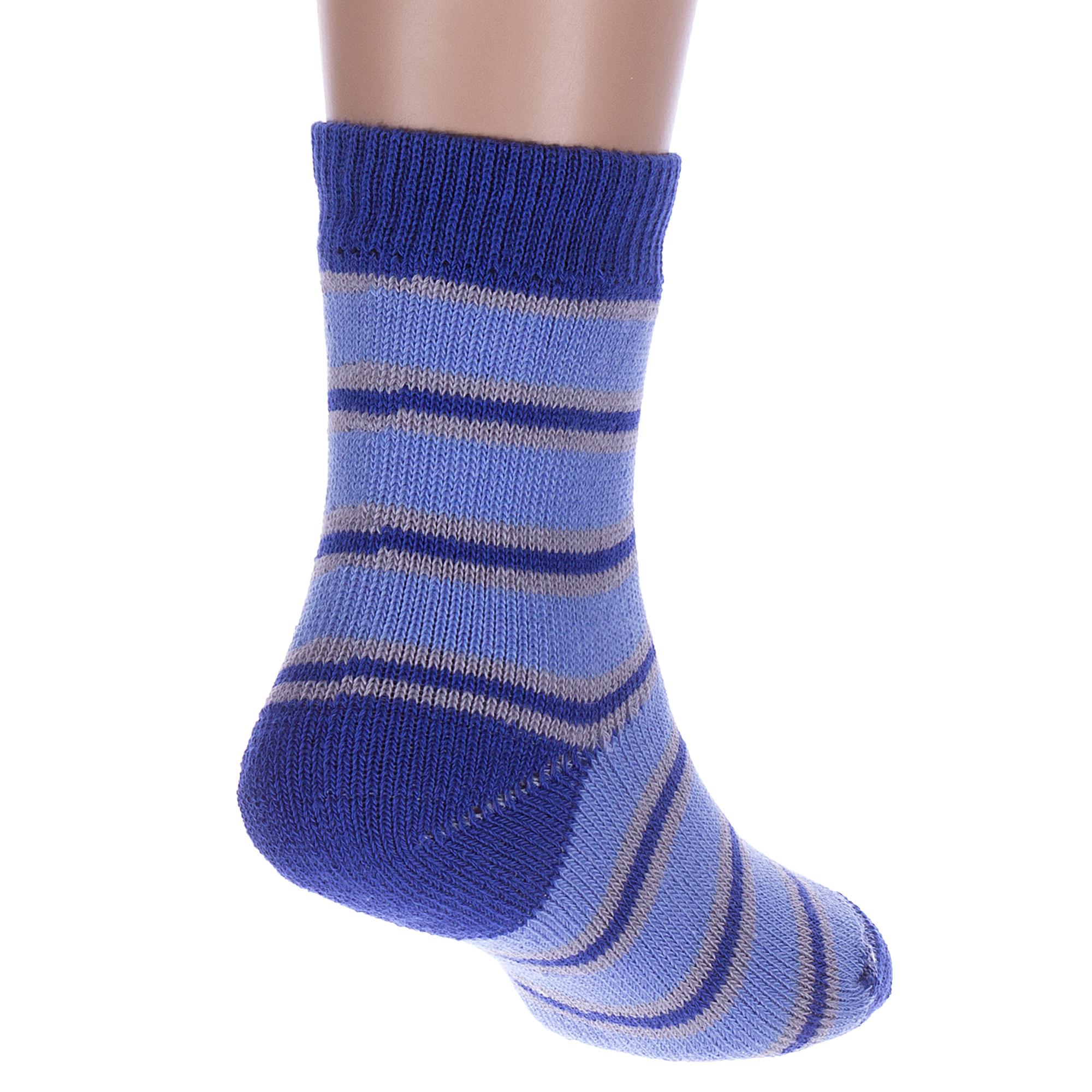 Межсезонные или зимние укороченные детские носки, цвет синий-голубой, теплые, повседневные, махровые, возможно бесшовные, принт (рисунок): полоски, с узором, состав: 98% хлопок, 1.5% эластан, 0.5% полиамид, арт. С114. Производитель «ООО Альтаир, г. Орск, Оренбургская обл, Россия» под брендом «Альтаир».