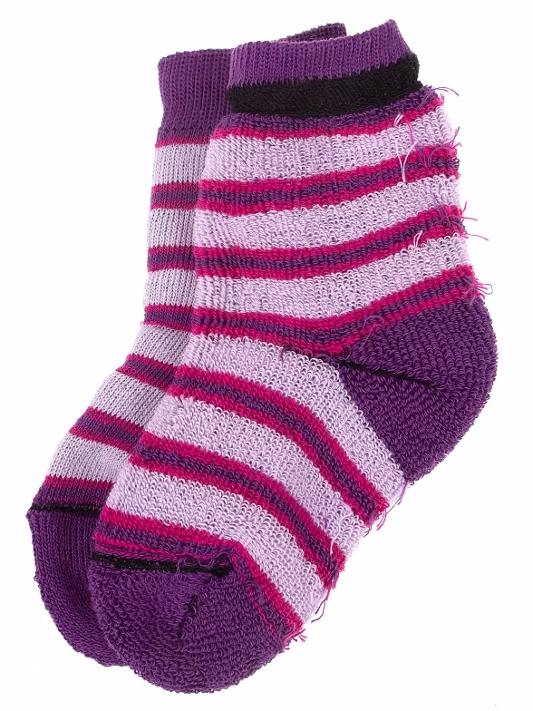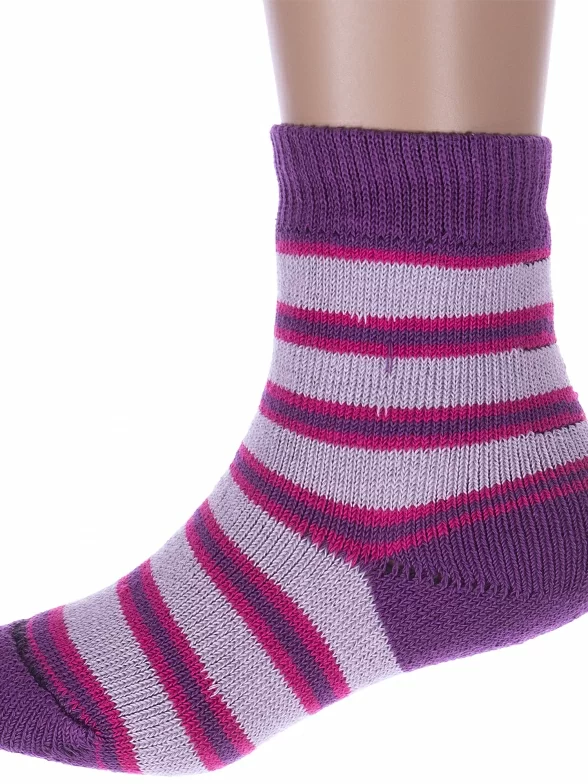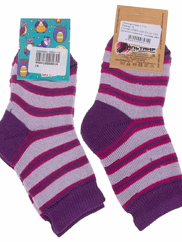 Межсезонные или зимние укороченные детские носки, цвет фиолетовый-сиреневый, теплые, повседневные, махровые, возможно бесшовные, принт (рисунок): полоски, с узором, состав: 98% хлопок, 1.5% эластан, 0.5% полиамид, арт. С114. Производитель «ООО Альтаир, г. Орск, Оренбургская обл, Россия» под брендом «Альтаир».