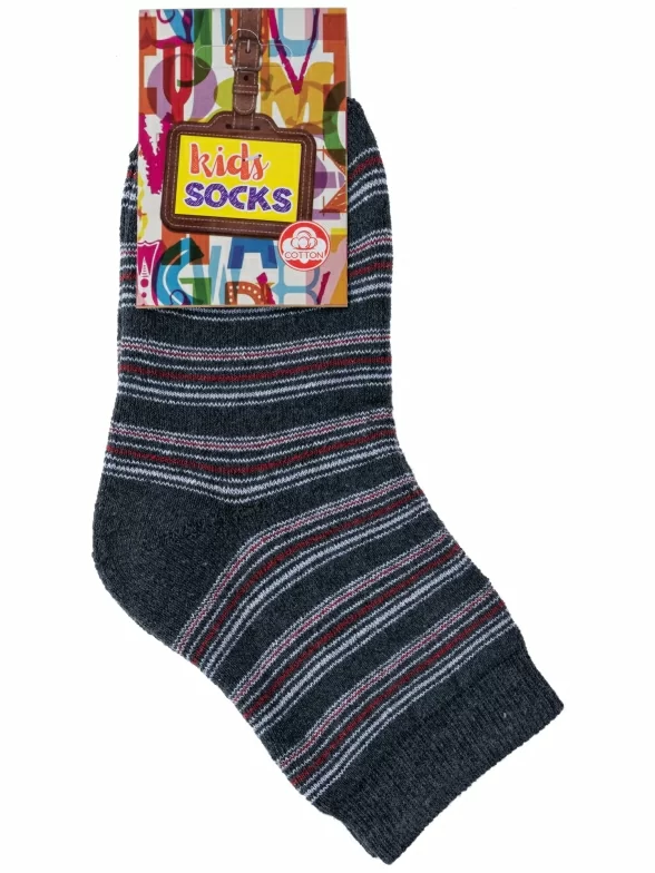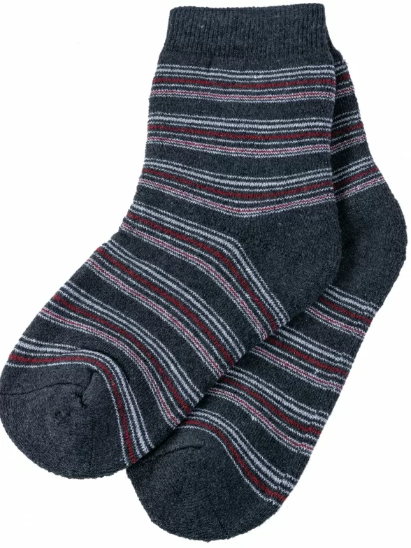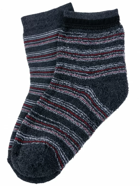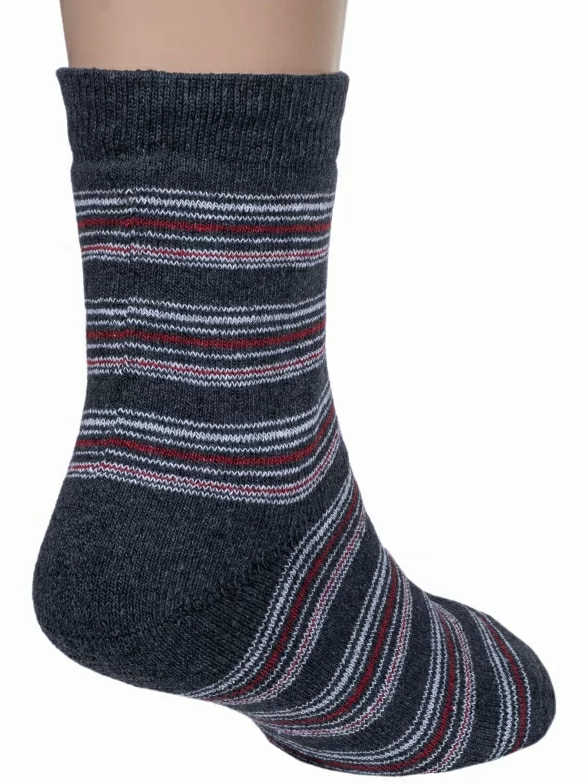 Зимние средней длины детские носки, цвет темно-серый, теплые, махровые, классические, шов обычный (не бесшовные), принт (рисунок): полоски, с узором, состав: 75% хлопок, 23% полиамид, 2% эластан, арт. С30. Производитель «ООО Альтаир, г. Орск, Оренбургская обл, Россия» под брендом «Альтаир».
