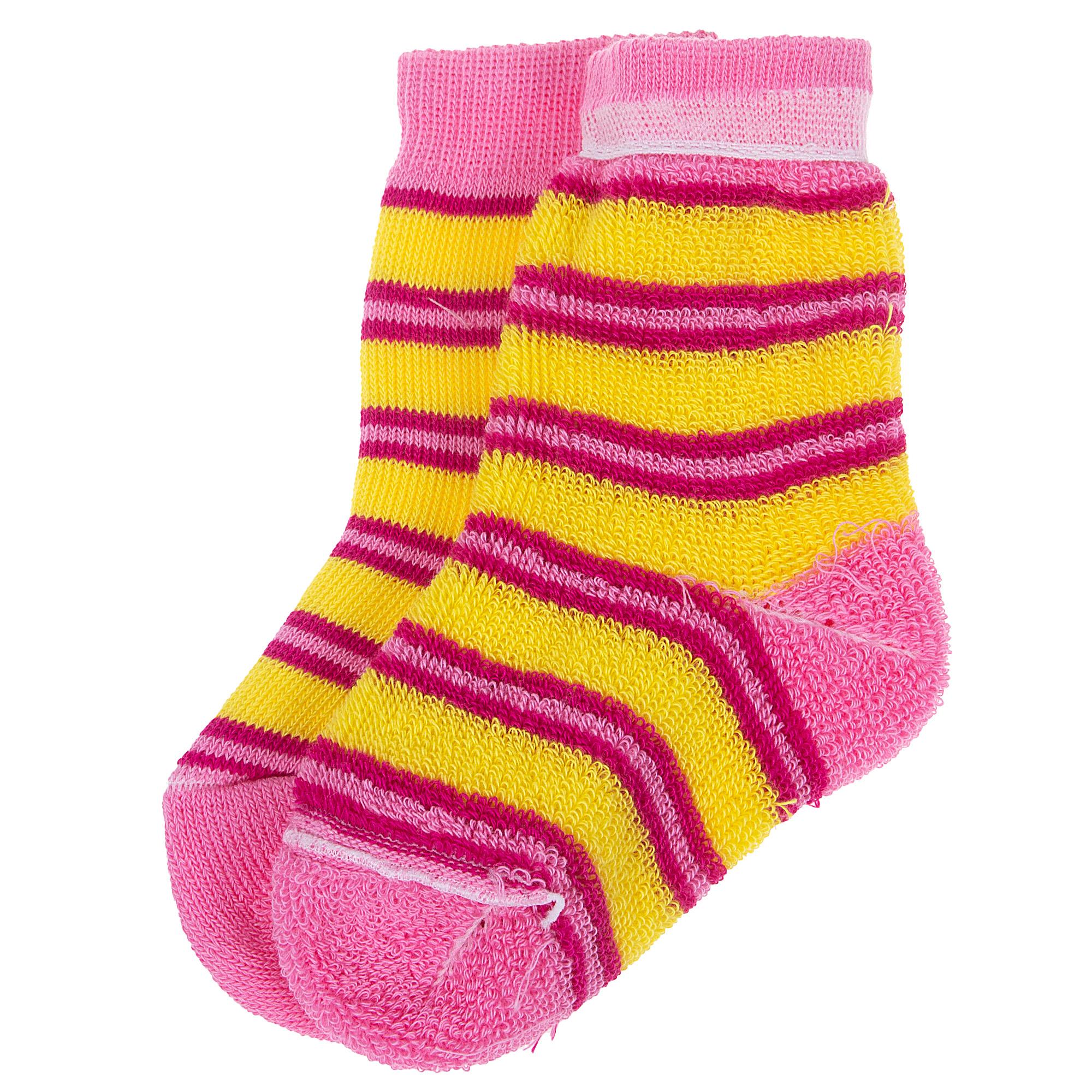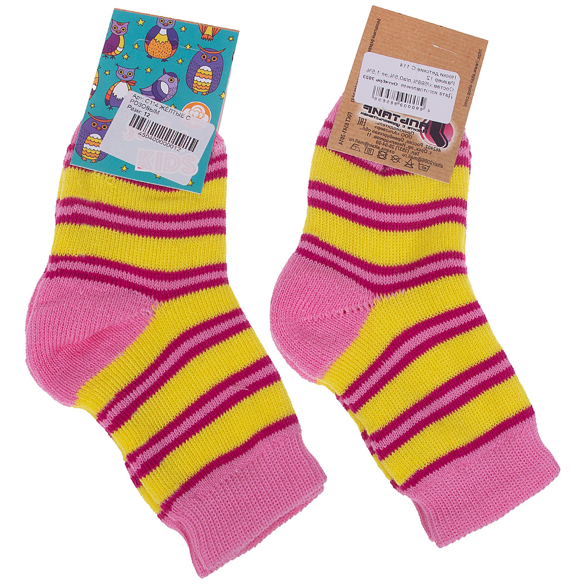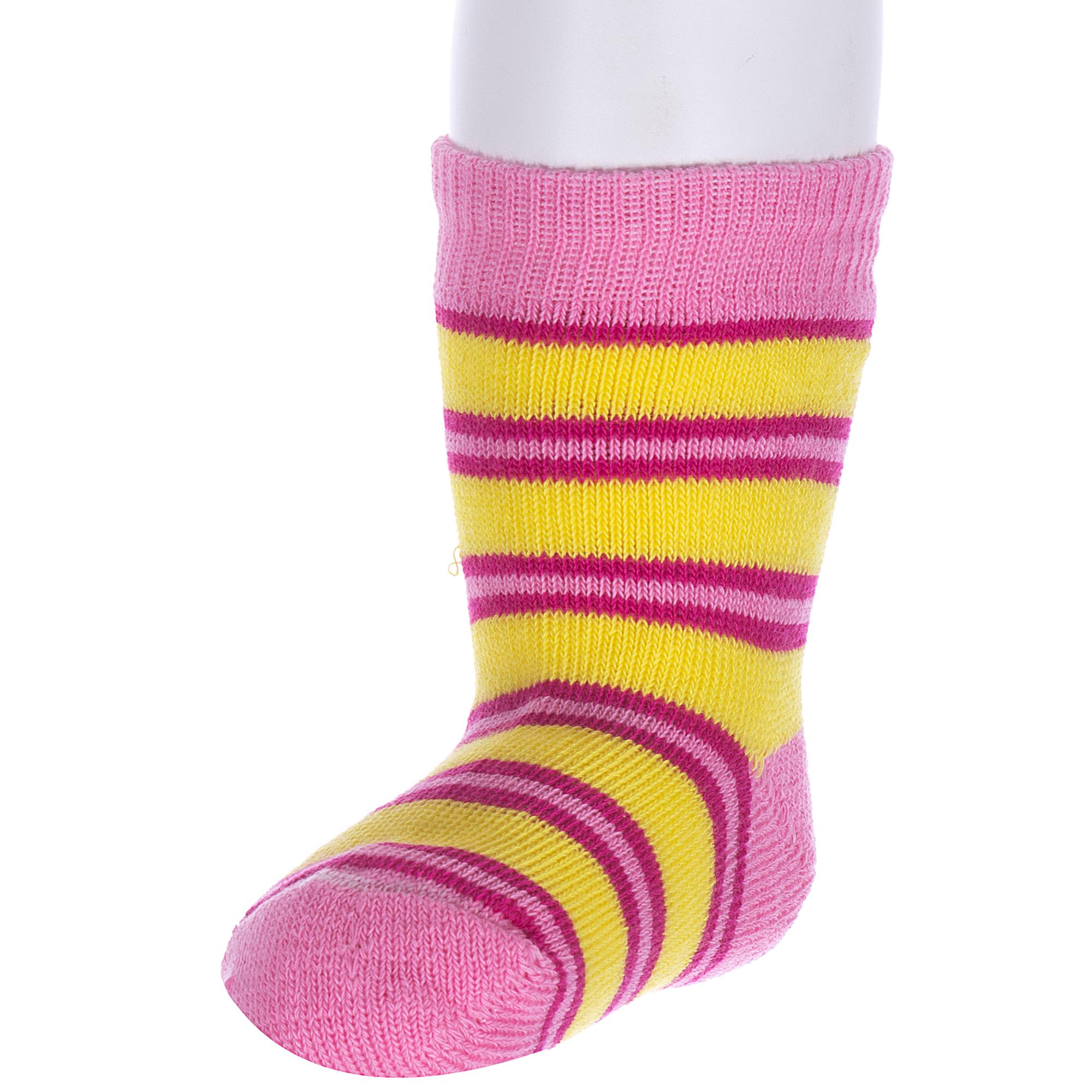 Межсезонные или зимние укороченные детские носки, цвет розовый-желтый, теплые, повседневные, махровые, возможно бесшовные, принт (рисунок): полоски, с узором, состав: 98% хлопок, 1.5% эластан, 0.5% полиамид, арт. С114. Производитель «ООО Альтаир, г. Орск, Оренбургская обл, Россия» под брендом «Альтаир».