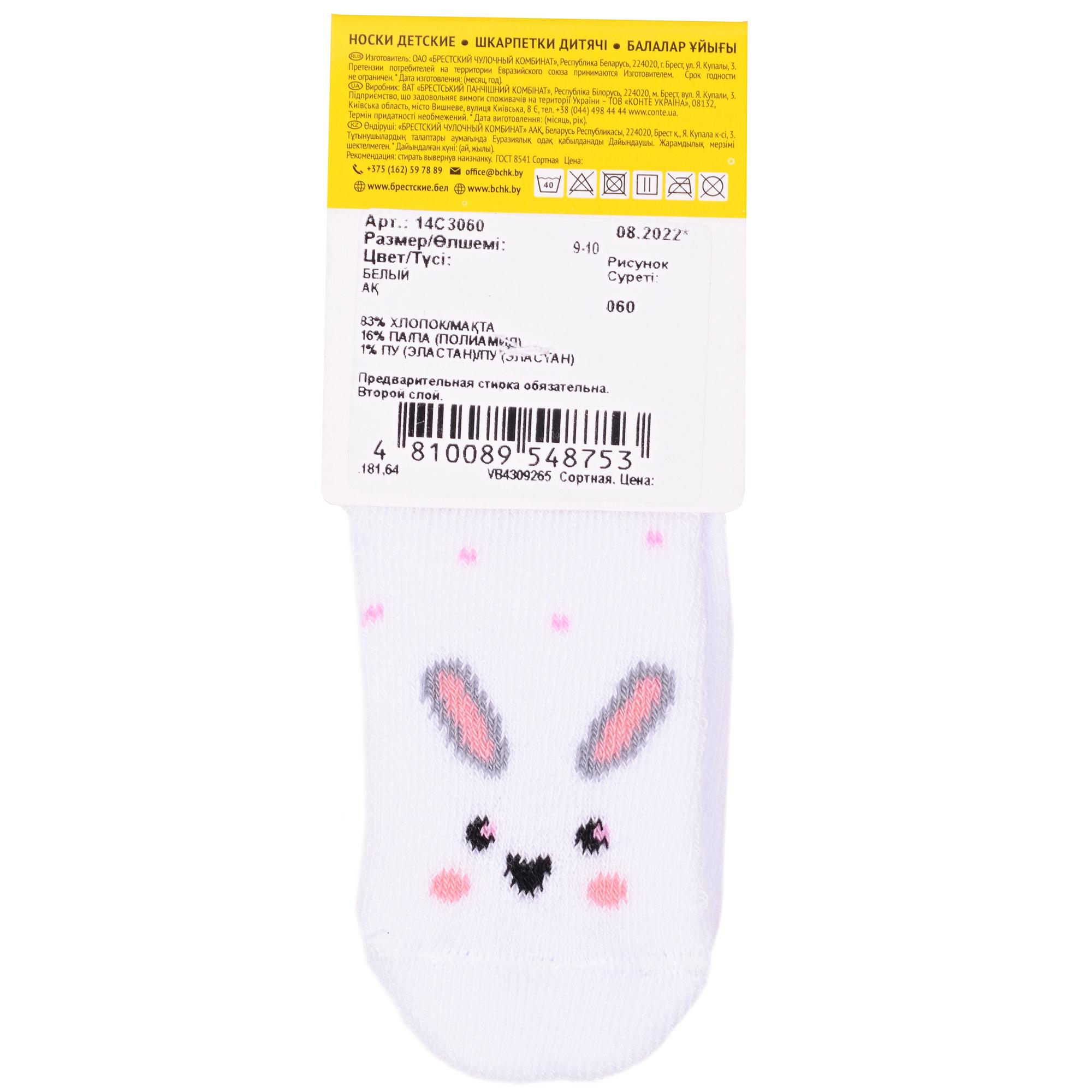 Межсезонные или зимние укороченные детские носки, цвет белый, теплые, повседневные, махровые, шов кеттельный (бесшовная технология), принт (рисунок): животные, горох / точка, с узором, состав: 83% хлопок, 16% полиамид, 1% эластан, арт. 14С3060. Производитель «Брестский чулочный комбинат ОАО, Беларусь» под брендом «Брестские (бчк)».