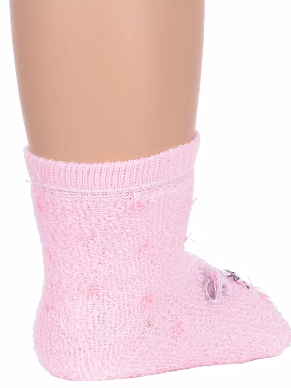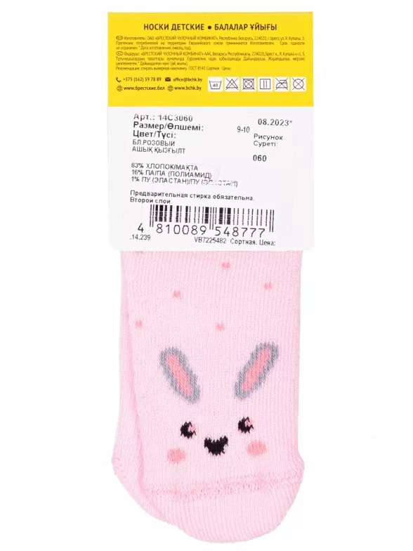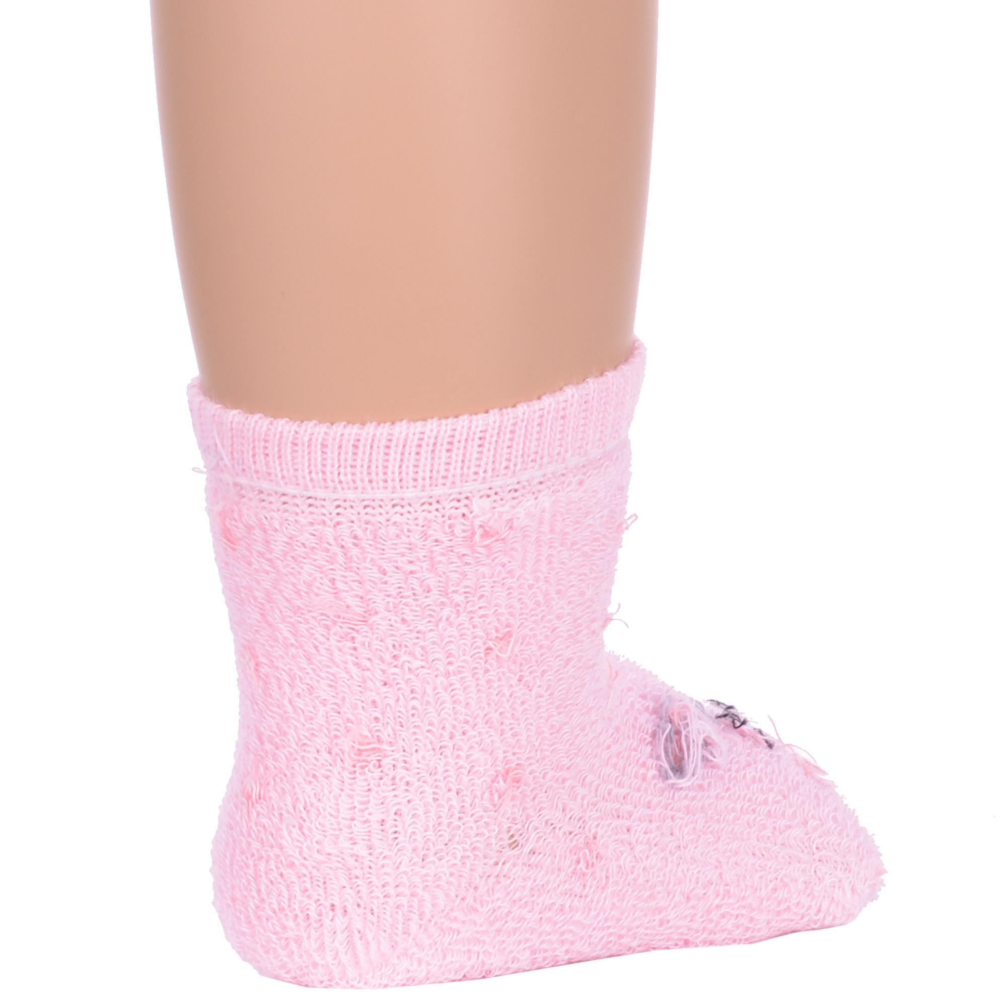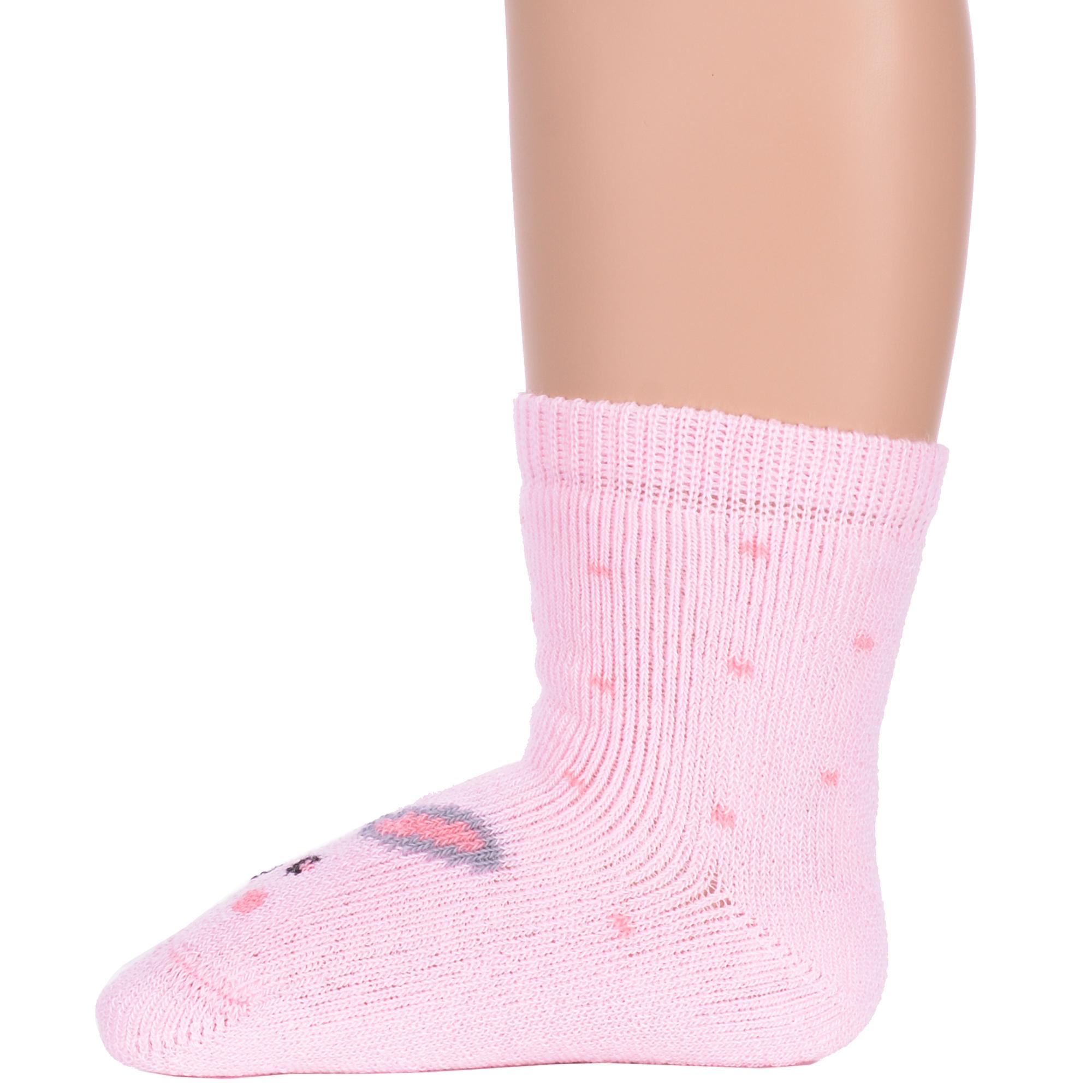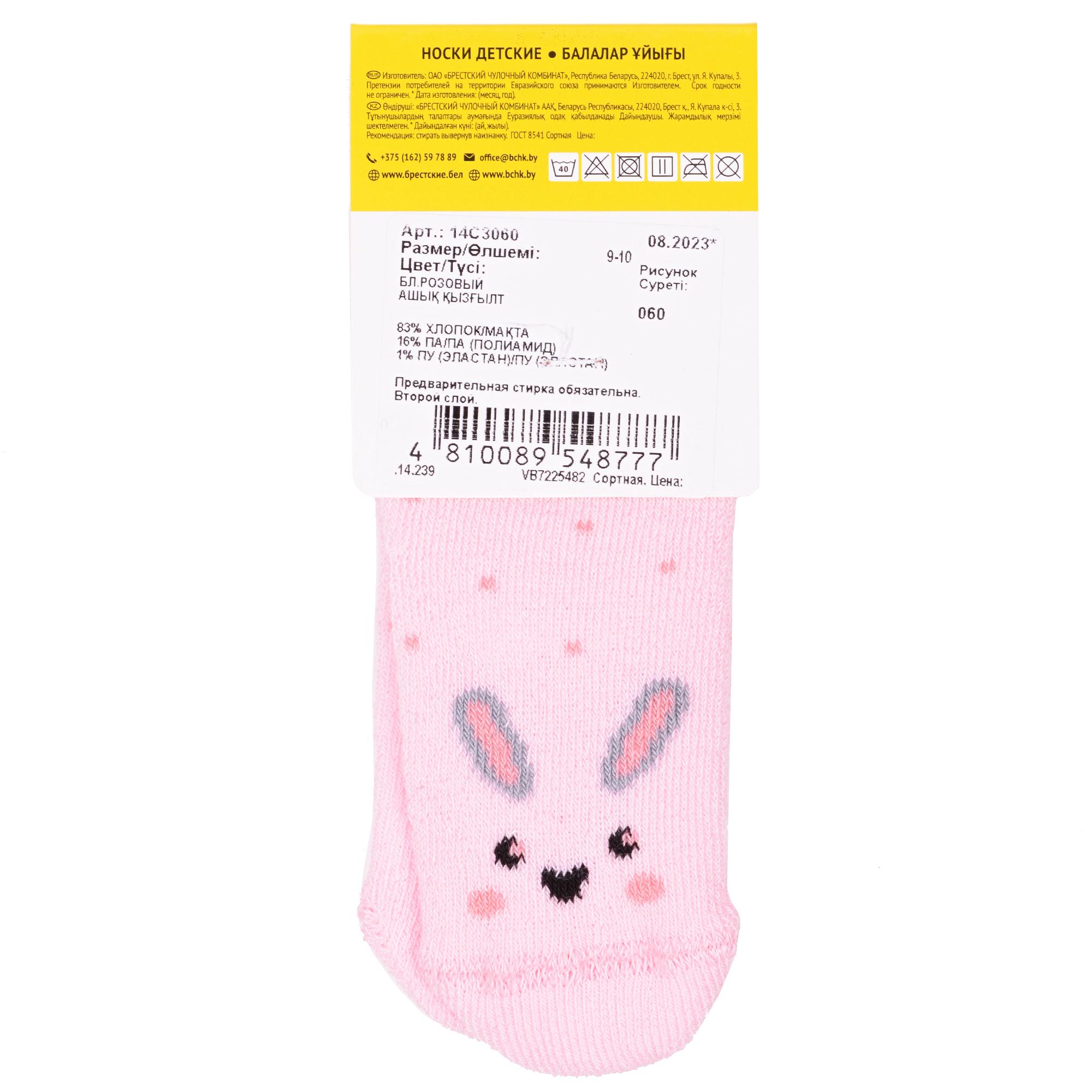 Межсезонные или зимние укороченные детские носки, цвет розовый, теплые, повседневные, махровые, шов кеттельный (бесшовная технология), принт (рисунок): животные, горох / точка, с узором, состав: 83% хлопок, 16% полиамид, 1% эластан, арт. 14С3060. Производитель «Брестский чулочный комбинат ОАО, Беларусь» под брендом «Брестские (бчк)».