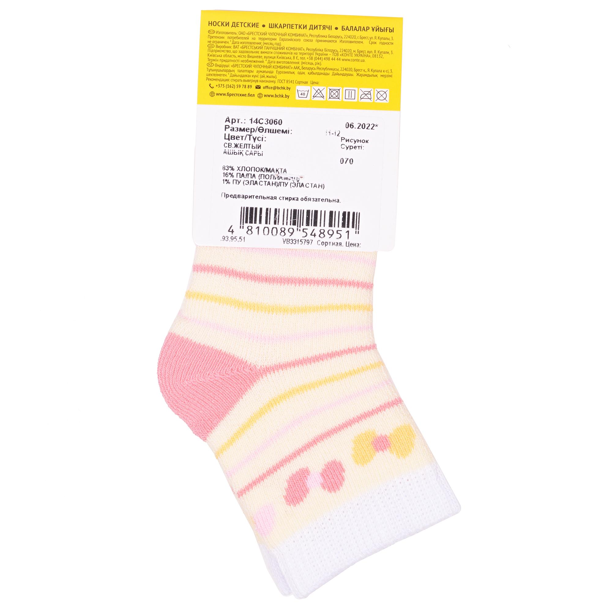 Межсезонные или зимние укороченные детские носки, цвет желтый, теплые, повседневные, махровые, шов кеттельный (бесшовная технология), принт (рисунок): полоски, контрастные пятка / мысок / резинка, бабочки / бантики, с узором, состав: 83% хлопок, 16% полиамид, 1% эластан, арт. 14С3060. Производитель «Брестский чулочный комбинат ОАО, Беларусь» под брендом «Брестские (бчк)».