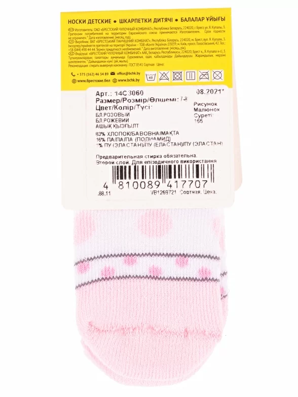 Межсезонные или зимние укороченные детские носки, теплые, состав: 83% хлопок, 16% полиамид, 1% эластан, фабричный артикул 14С3060. Производитель «Брестский чулочный комбинат ОАО, Беларусь» под брендом «Брестские (бчк)».