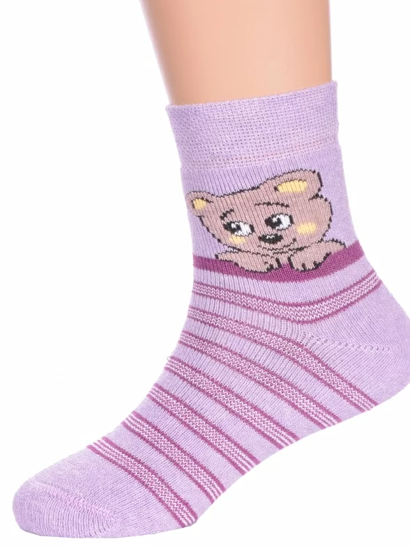 Межсезонные или зимние укороченные детские носки, цвет сиреневый, прикольные, состав: 83% хлопок, 16% полиамид, 1% эластан, фабричный артикул 14С3060. Производитель «Брестский чулочный комбинат ОАО, Беларусь» под брендом «Брестские (бчк)».