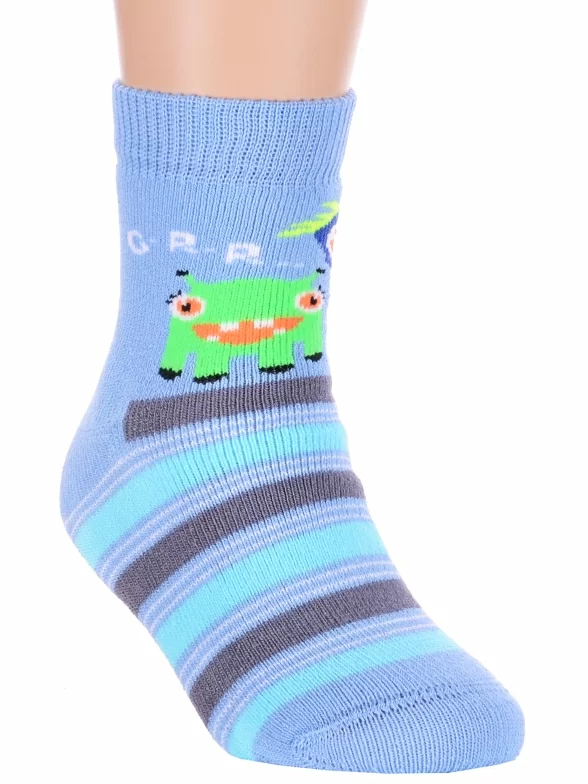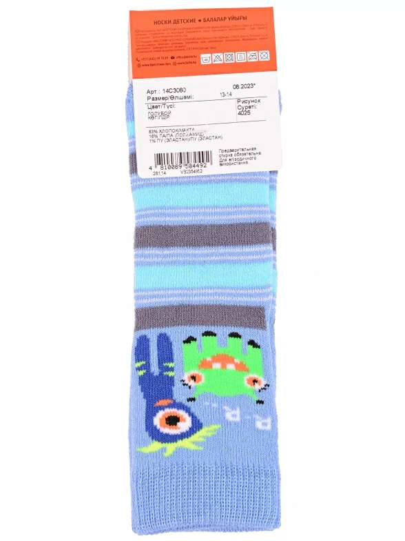 Зимние или межсезонные укороченные детские носки, цвет голубой, прикольные, состав: 83% хлопок, 16% полиамид, 1% эластан, фабричный артикул 14С3060. Производитель «Брестский чулочный комбинат ОАО, Беларусь» под брендом «Брестские (бчк)».