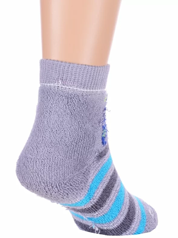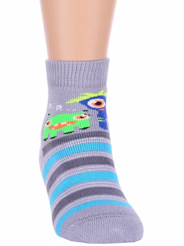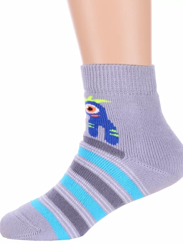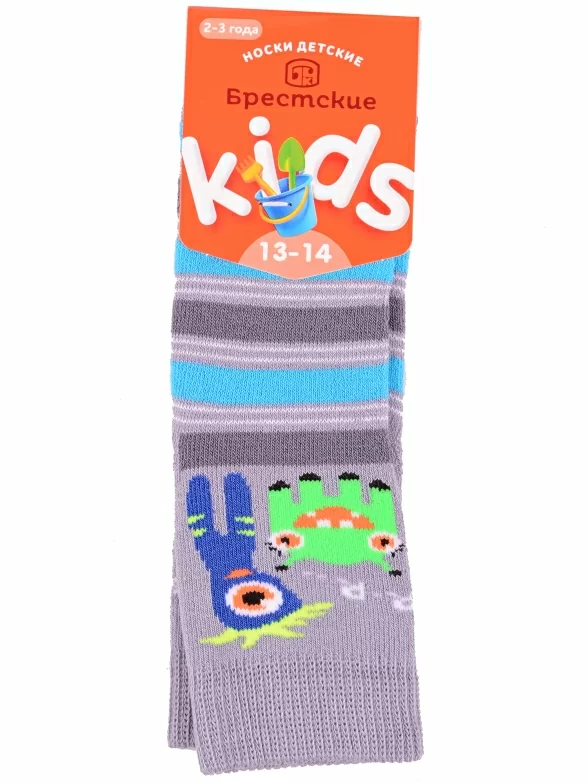 Зимние или межсезонные укороченные детские носки, цвет серый-сиреневый, прикольные, состав: 83% хлопок, 16% полиамид, 1% эластан, фабричный артикул 14С3060. Производитель «Брестский чулочный комбинат ОАО, Беларусь» под брендом «Брестские (бчк)».