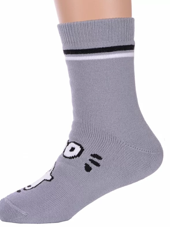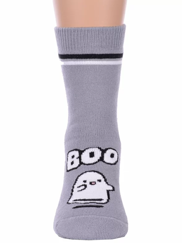 Межсезонные или зимние укороченные детские носки, цвет светло-серый, теплые, повседневные, махровые, возможно бесшовные, принт (рисунок): хоррор / ужасы, надписи, с узором, состав: 83% хлопок, 16% полиамид, 1% эластан, арт. 14С3060. Производитель «Брестский чулочный комбинат ОАО, Беларусь» под брендом «Брестские (бчк)».