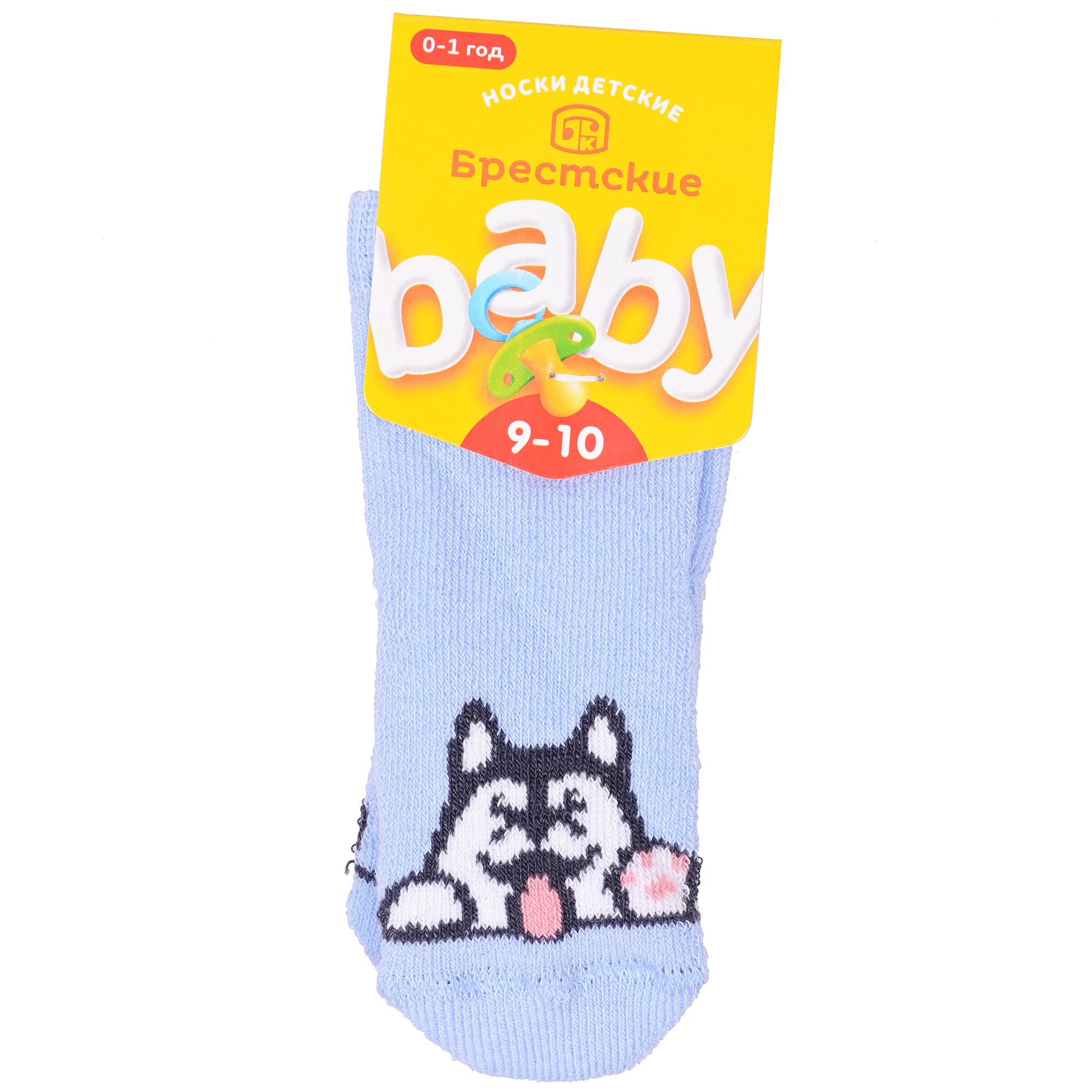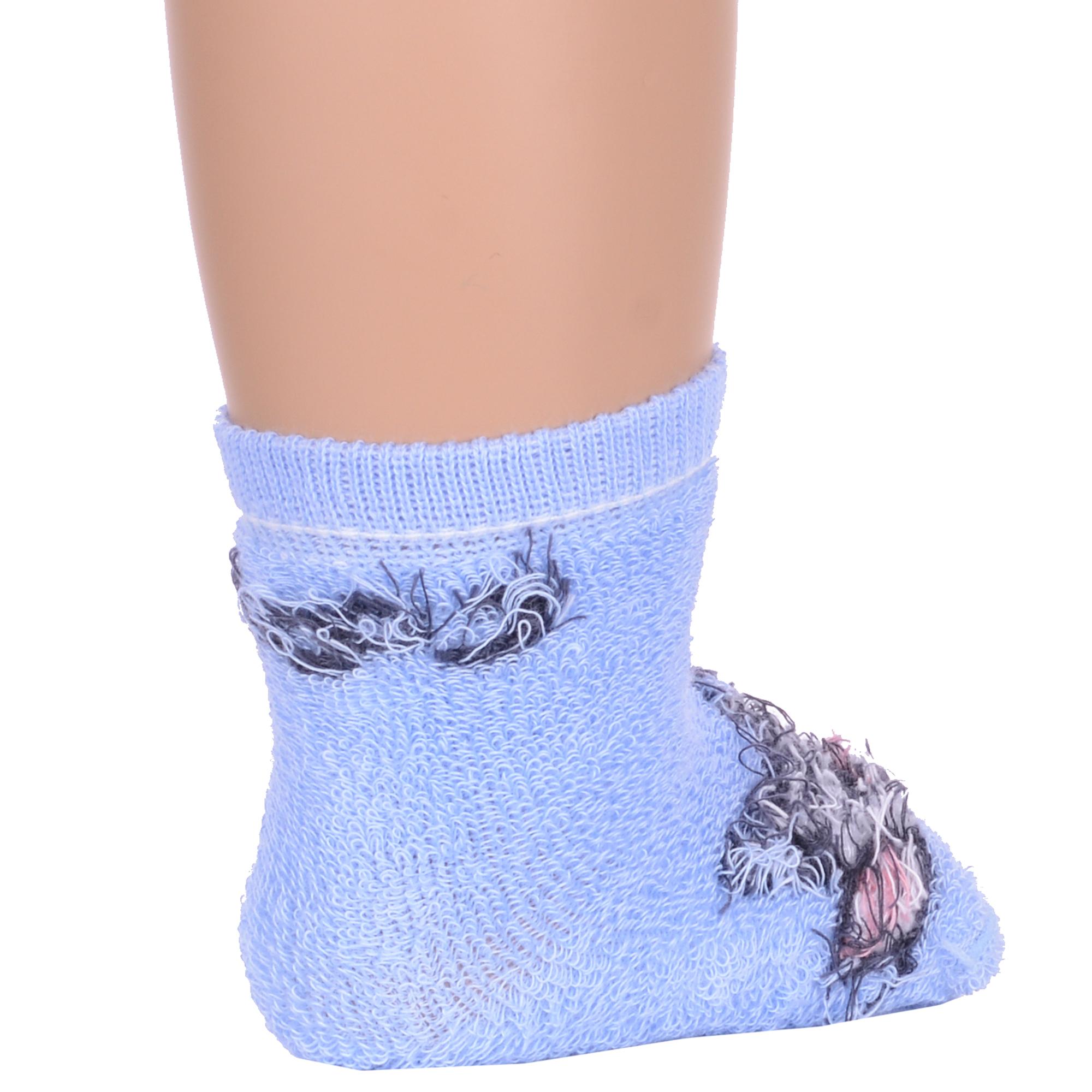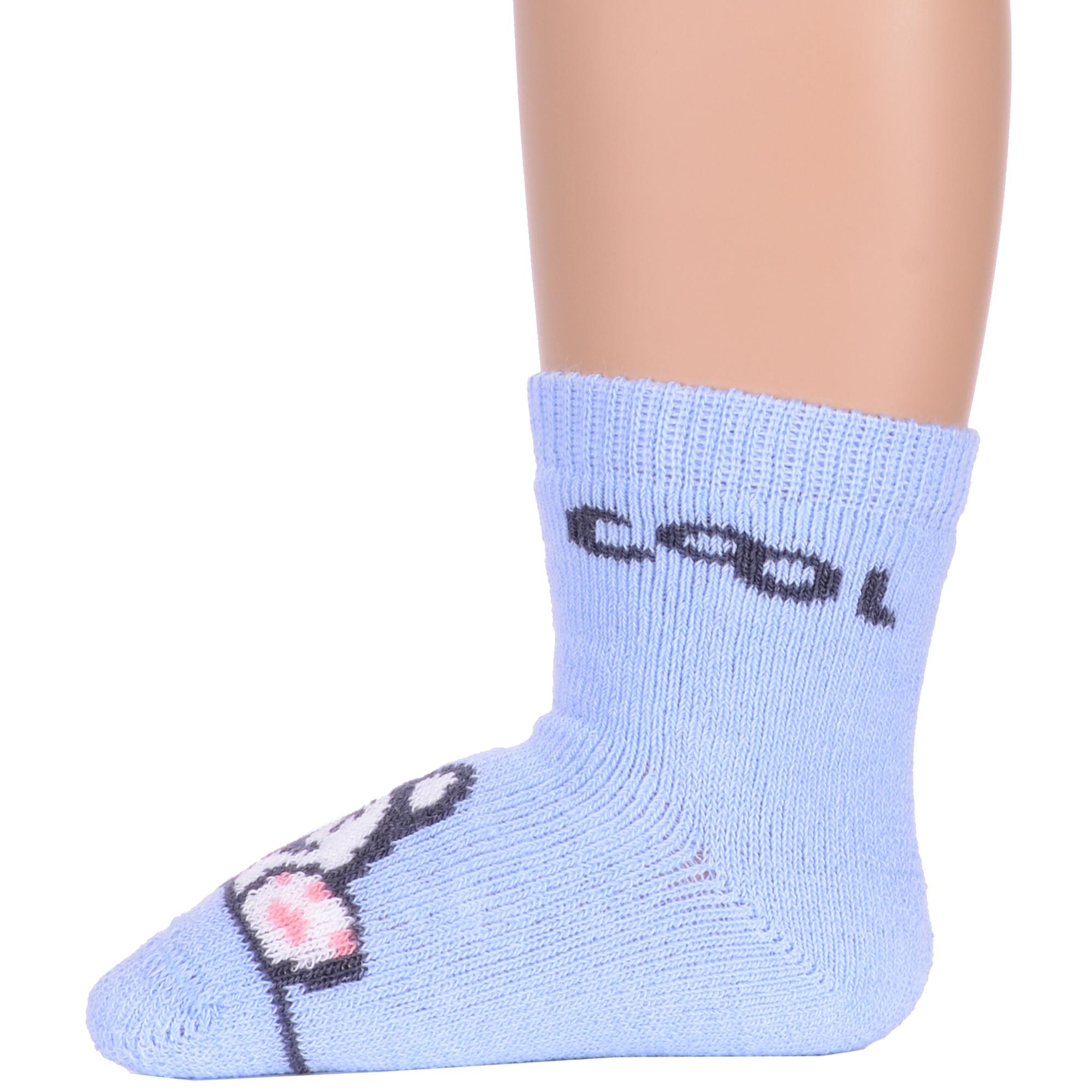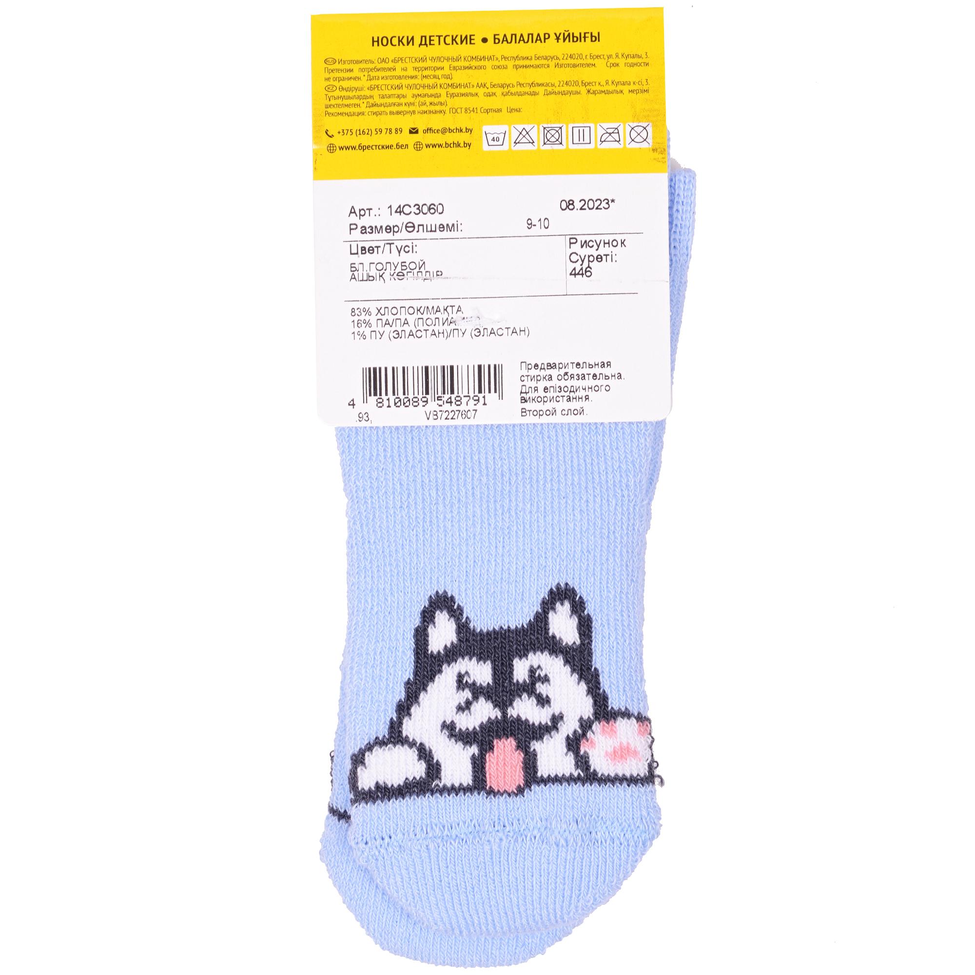 Межсезонные или зимние укороченные детские носки, цвет голубой, теплые, повседневные, махровые, шов кеттельный (бесшовная технология), принт (рисунок): надписи, животные, с узором, состав: 83% хлопок, 16% полиамид, 1% эластан, арт. 14С3060. Производитель «Брестский чулочный комбинат ОАО, Беларусь» под брендом «Брестские (бчк)».