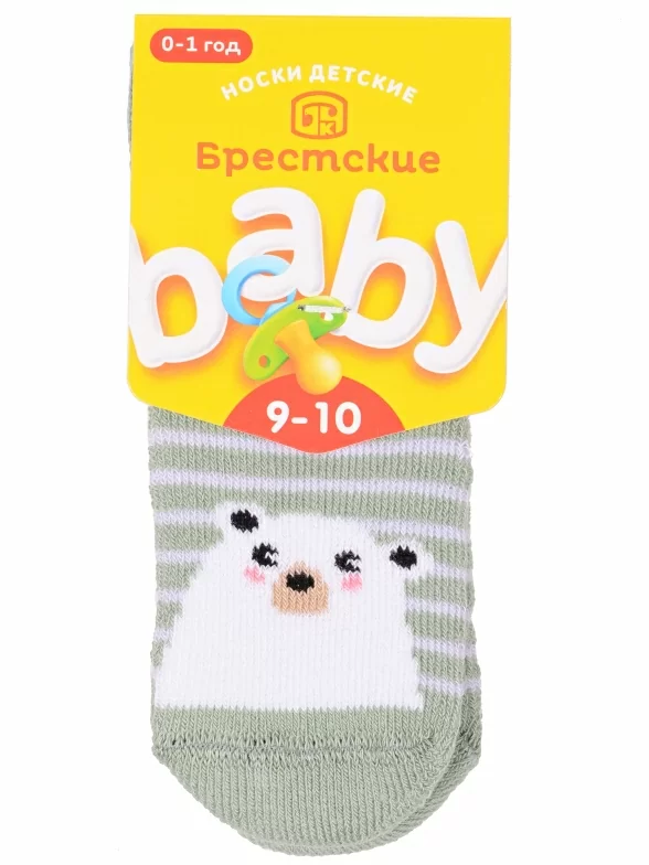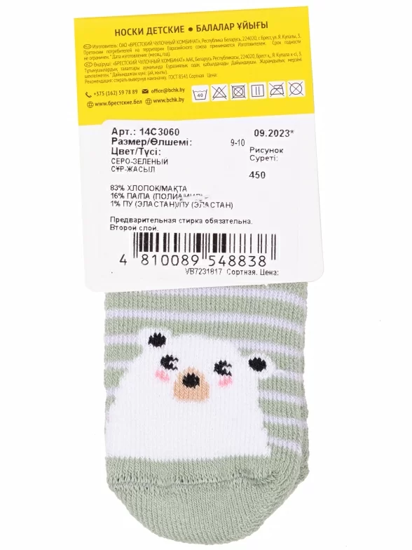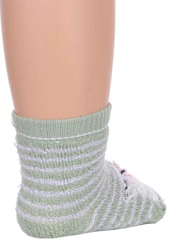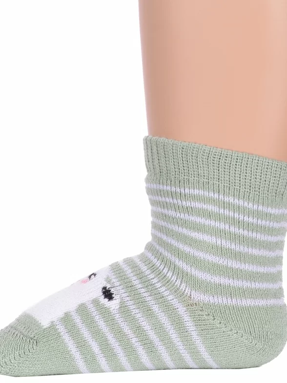 Межсезонные или зимние укороченные детские носки, цвет зеленый, теплые, повседневные, махровые, шов кеттельный (бесшовная технология), принт (рисунок): полоски, животные, с узором, состав: 83% хлопок, 16% полиамид, 1% эластан, арт. 14С3060. Производитель «Брестский чулочный комбинат ОАО, Беларусь» под брендом «Брестские (бчк)».