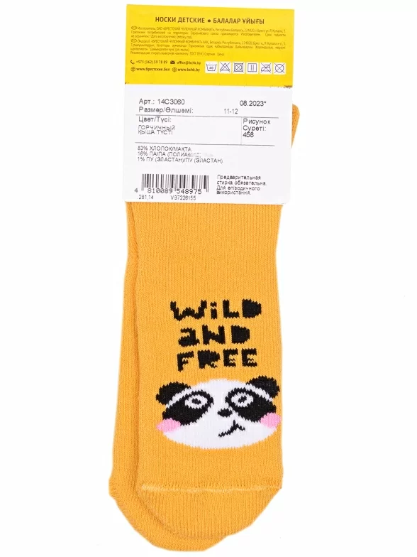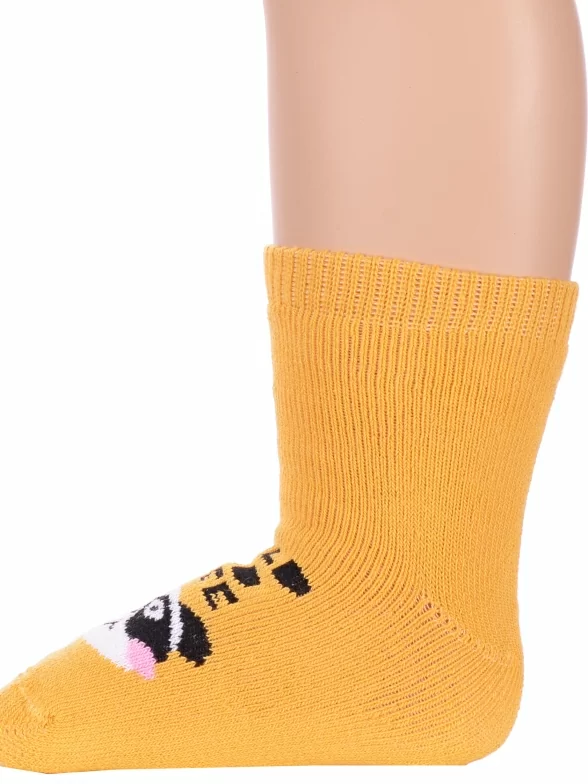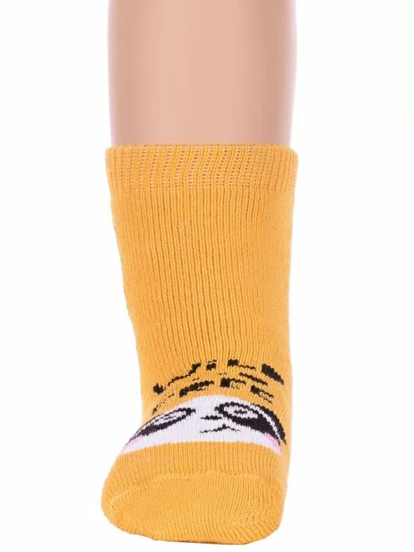 Межсезонные или зимние укороченные детские носки, цвет желтый, теплые, повседневные, махровые, возможно бесшовные, принт (рисунок): надписи, животные, с узором, состав: 83% хлопок, 16% полиамид, 1% эластан, арт. 14С3060. Производитель «Брестский чулочный комбинат ОАО, Беларусь» под брендом «Брестские (бчк)».