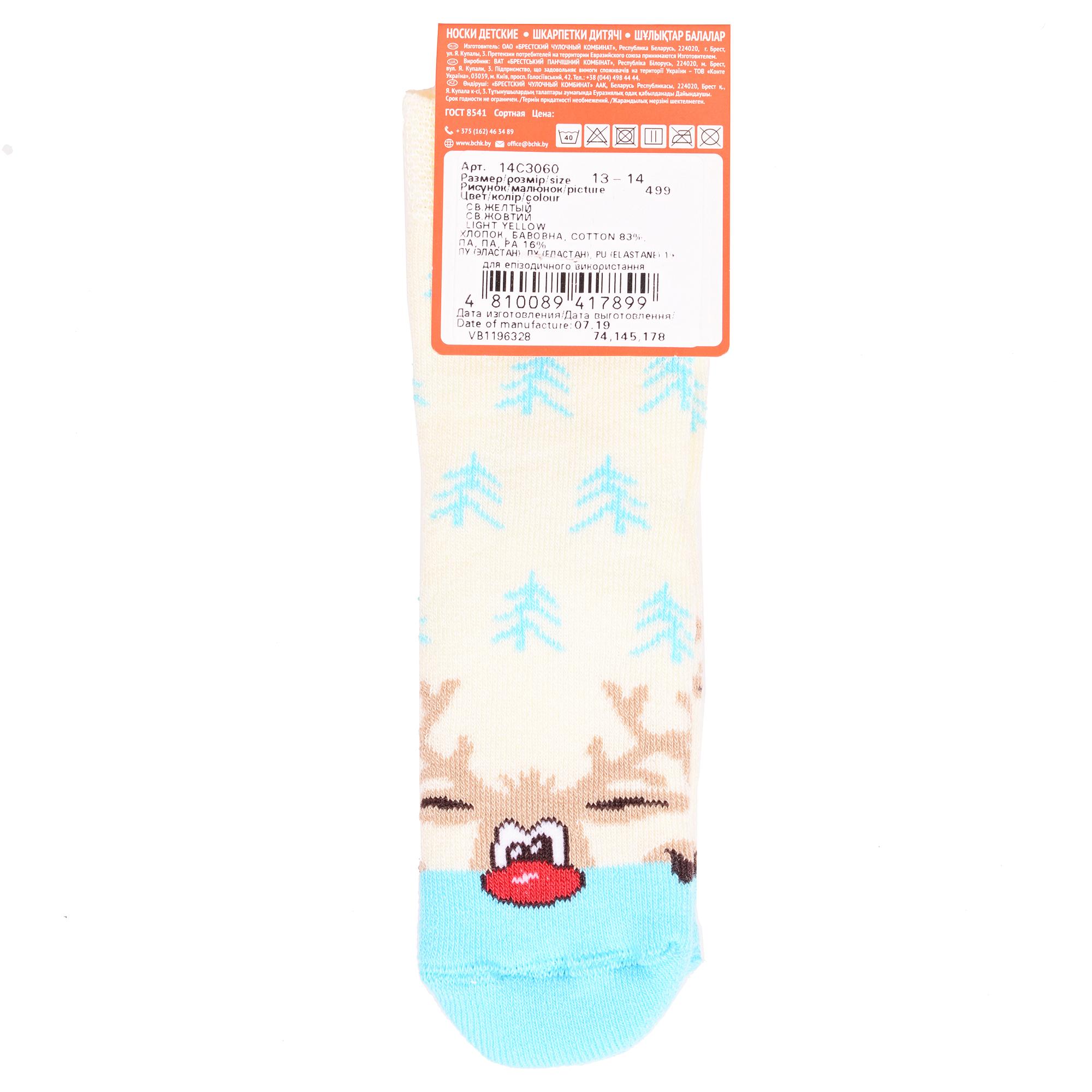 Зимние или межсезонные укороченные детские носки, цвет желтый, разного цвета, состав: 83% хлопок, 16% полиамид, 1% эластан, фабричный артикул 14С3060. Производитель «Брестский чулочный комбинат ОАО, Беларусь» под брендом «Брестские (бчк)».
