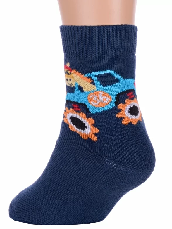 Зимние или межсезонные укороченные детские носки, цвет синий, прикольные, состав: 83% хлопок, 16% полиамид, 1% эластан, фабричный артикул 14С3060. Производитель «Брестский чулочный комбинат ОАО, Беларусь» под брендом «Брестские (бчк)».