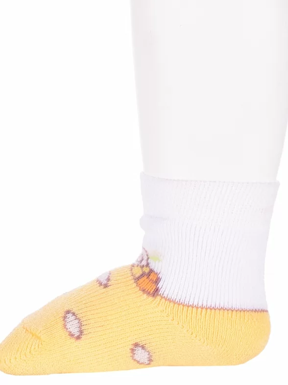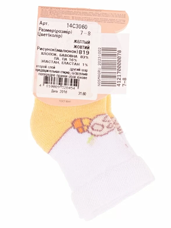 Межсезонные или зимние укороченные детские носки, цвет желтый, теплые, состав: 83% хлопок, 16% полиамид, 1% эластан, фабричный артикул 14С3060. Производитель «Брестский чулочный комбинат ОАО, Беларусь» под брендом «Брестские (бчк)».