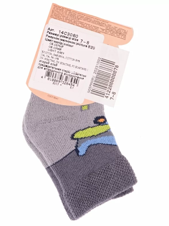 Межсезонные или зимние укороченные детские носки, цвет светло-серый, теплые, состав: 83% хлопок, 16% полиамид, 1% эластан, фабричный артикул 14С3060. Производитель «Брестский чулочный комбинат ОАО, Беларусь» под брендом «Брестские (бчк)».