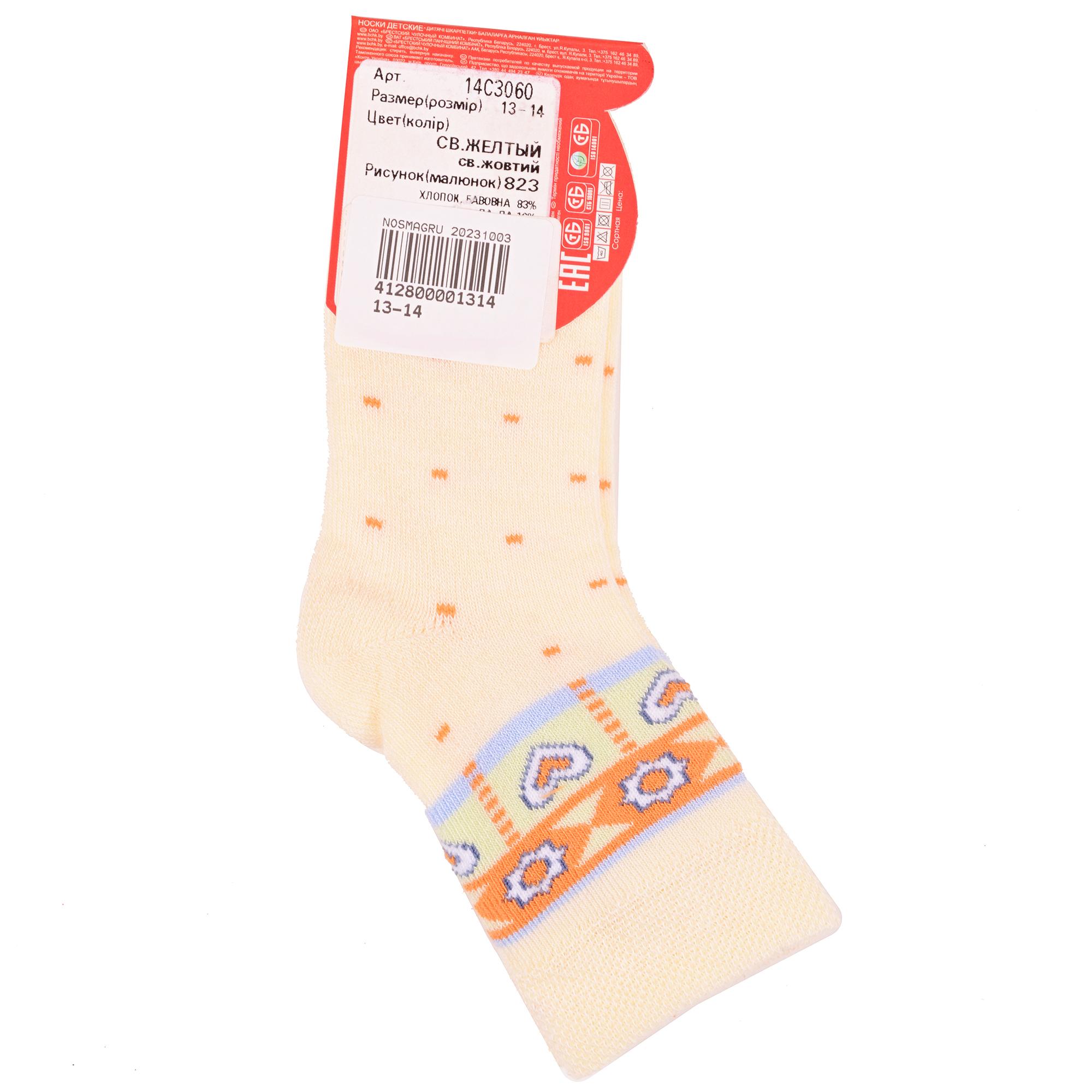 Зимние или межсезонные укороченные детские носки, цвет желтый, прикольные, состав: 83% хлопок, 16% полиамид, 1% эластан, фабричный артикул 14С3060. Производитель «Брестский чулочный комбинат ОАО, Беларусь» под брендом «Брестские (бчк)».