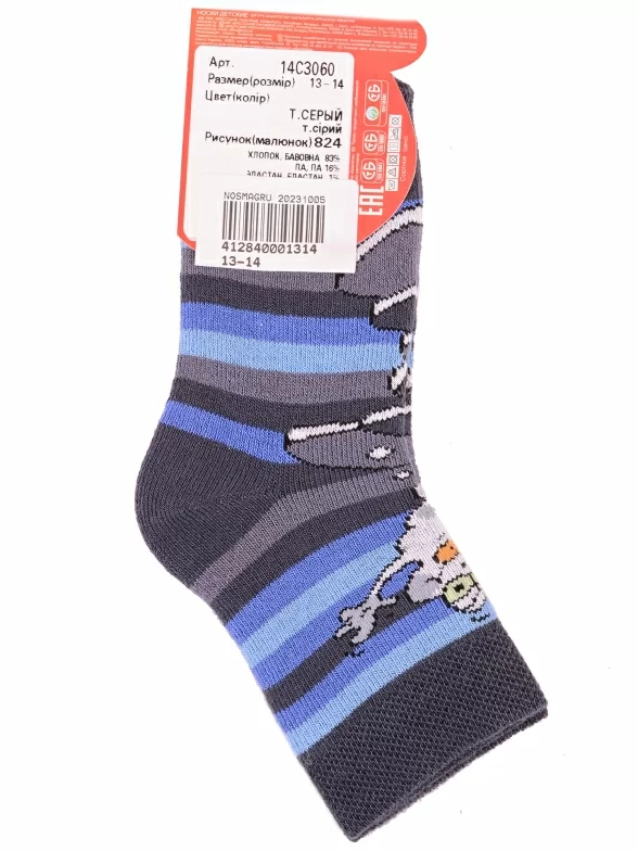 Зимние или межсезонные укороченные детские носки, цвет темно-серый, прикольные, состав: 83% хлопок, 16% полиамид, 1% эластан, фабричный артикул 14С3060. Производитель «Брестский чулочный комбинат ОАО, Беларусь» под брендом «Брестские (бчк)».