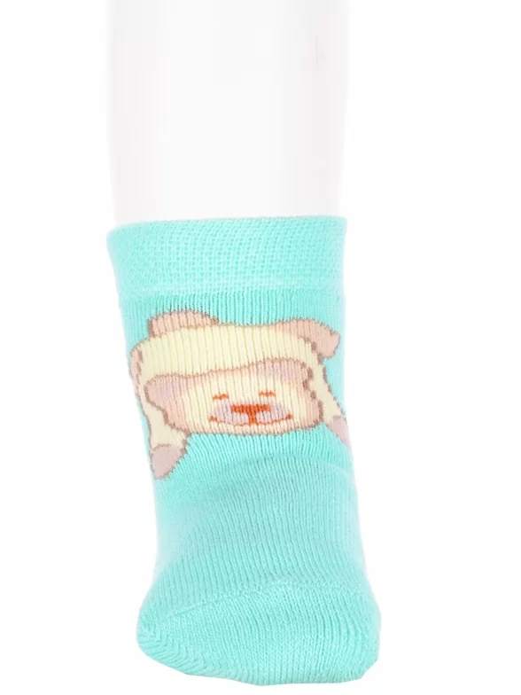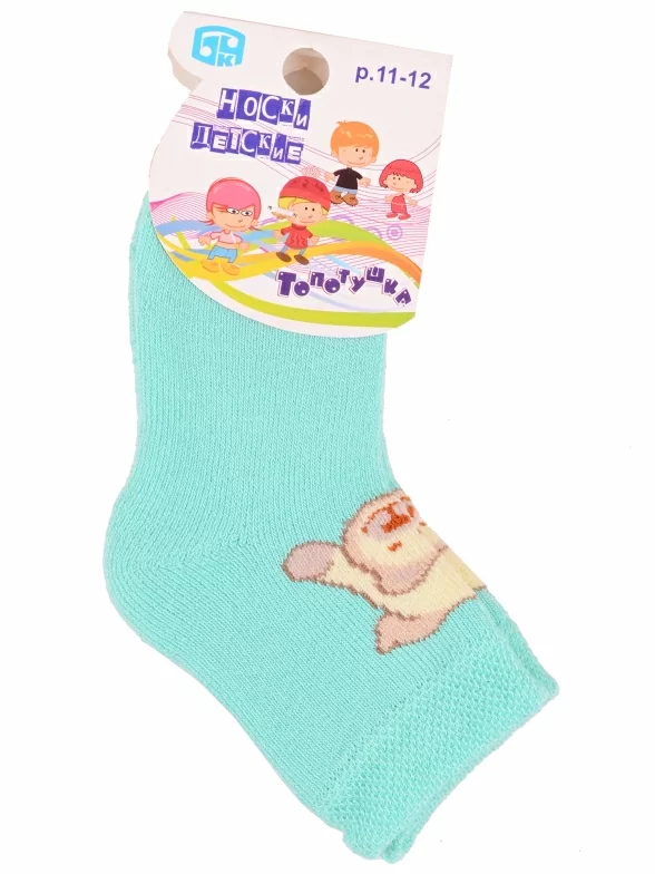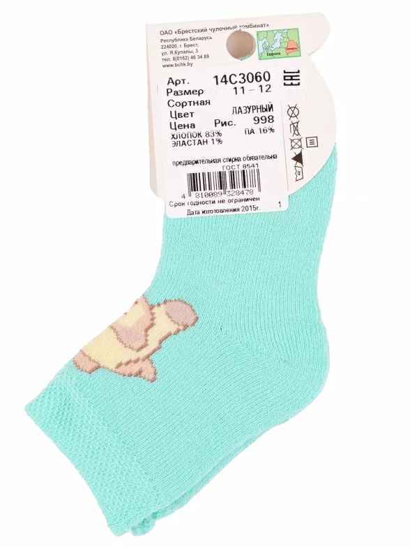 Зимние или межсезонные укороченные детские носки, цвет бирюзовый, прикольные, состав: 83% хлопок, 16% полиамид, 1% эластан, фабричный артикул 14С3060. Производитель «Брестский чулочный комбинат ОАО, Беларусь» под брендом «Брестские (бчк)».