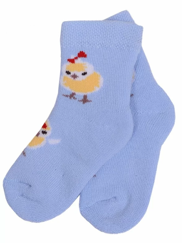 Детские махровые носки от Бресткого чулочного комбината связаны из пряжи на основе хлопка. Модель, фиксирующаяся широкой резинкой. Особенность модели - принт с птенцами.