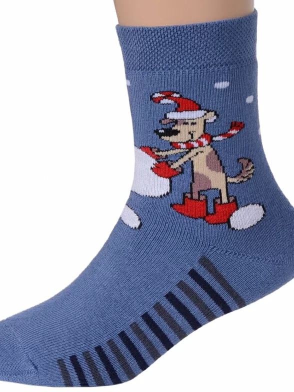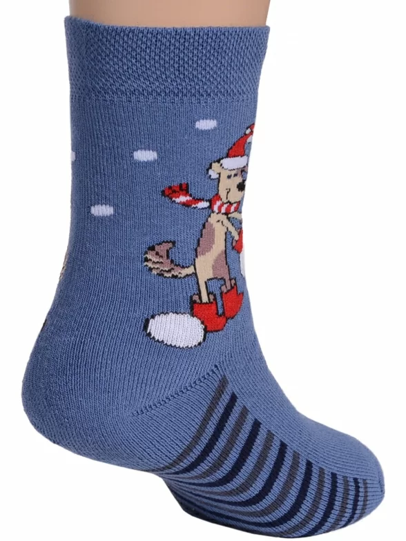 Детские носки, связанные из хлопковой пряжи, украшены принтом в виде собаки и снежных шариков. Модель от Бресткого чулочного комбината фиксируется широкой эластичной резинкой.
