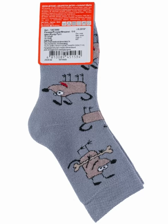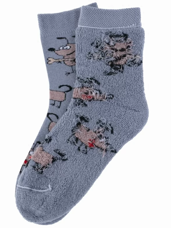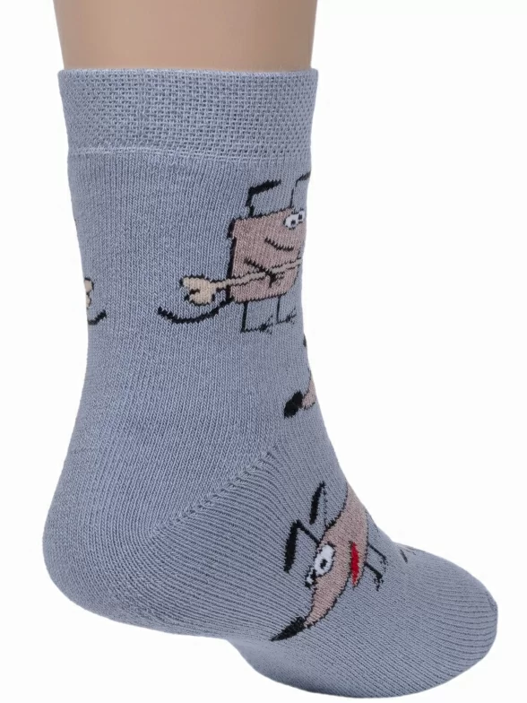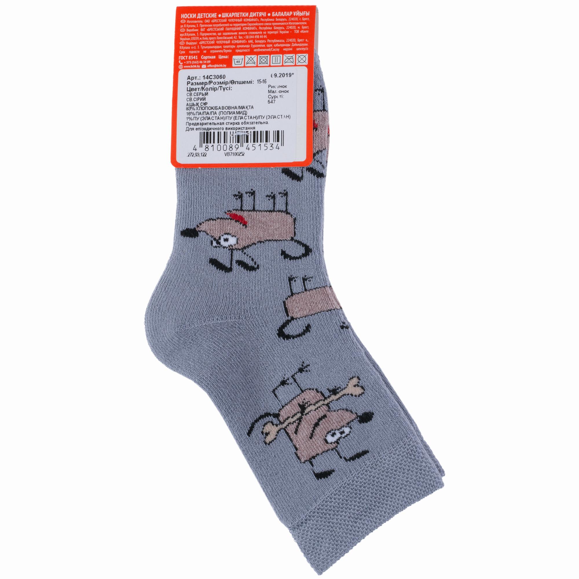 Зимние укороченные детские носки, цвет светло-серый, теплые, махровые, повседневные, шов обычный (не бесшовные), принт (рисунок): животные, с узором, крупные контрастные рисунки, состав: 83% хлопок, 16% полиамид, 1% эластан, арт. 14С3060. Производитель «Брестский чулочный комбинат ОАО, Беларусь» под брендом «Брестские (бчк)».