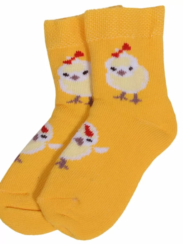 Детские махровые носки от Бресткого чулочного комбината связаны из пряжи на основе хлопка. Модель, фиксирующаяся широкой резинкой. Особенность модели - принт с птенцами.